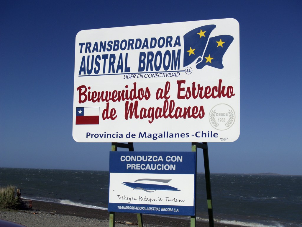 Objectif : Río Gallegos – Ushuaïa en stop, 400 km. Et ça commence plutôt bien. Après avoir demandé à tous les routiers où ils allaient (au Nord, donc pas dans notre direction), nous allons à l’entrée de la station et Umberto nous propose de nous emmener jusqu’à la frontière, à une centaine de km de là. Il nous dépose à la frontière, car il ne veut pas avoir à déclarer qu’il transporte de gens, nous ne savons pas exactement pourquoi. A priori, c’est pour éviter les mauvaises surprises au cas où on passerait des trucs illégaux… En tout cas, on passe la frontière sans problème, et les Chiliens ne passent même pas notre sac au scanner. Pour une fois, on a de la chance, on avait des fruits, hi hi. Nous voilà donc au Chili. On se place à l’entrée de la route, et après avoir vu passer 3 camions et 2 voitures, une auto s’arrête : c’est notre ami Umberto ! Cette fois, il nous propose de nous laisser au carrefour qui mène au traversier. Et oui, car il faut traverser le détroit de Magellan !