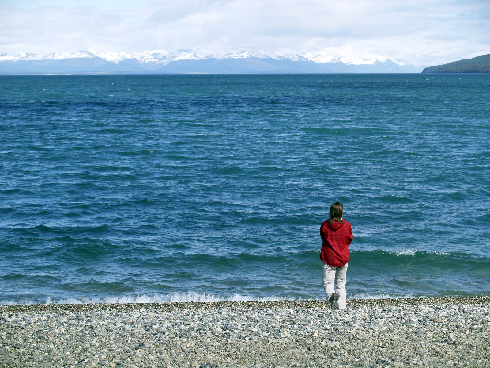 Il est vraiment gentil et nous fait la conversation, nous parle de l’Argentine. La route est magnifique, c’est réellement dépaysant. On croise tour à tour la mer, la pampa, des lagunes… C’est un autre monde. Une fois à Tolhuin, il fait un détour et nous emmène voir le lago Fagnando, en contrebas. C’est magnifique. La couleur du lac entouré de montagnes enneigées est exceptionnelle ! Le lac est immense. Côté montagne, on se croirait dans un bouquin de Tolkien. Côté lac, c’est tout simplement magnifique. Nous voyons en vrai ce qu’on voit dans les guides.