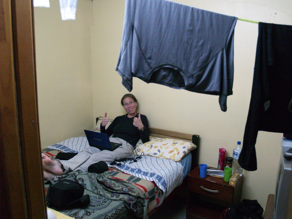 Aujourd’hui, nous n’avons pas de chance avec l’autostop. Personne ne nous prend, et nous continuons à marcher vers la sortie de la ville pour rattraper la rocade où passent les camions. Au bout d’environ 5 km, nous n’en pouvons plus, personne ne nous prend, nous sommes complètement sortis de la ville (sans pour autant avoir atteint la rocade), chose que nous voulions éviter. Démoralisés, nous décidons de faire demi-tour et d’aller à la gare routière acheter les billets de bus pour demain. Nous avons perdu notre journée et n’avons même pas fait d’économies, car il nous faut nous loger à Rio Grande, qui n’est pas du tout une ville touristique. Pas d’auberge de jeunesse ni de camping, et la moindre chambre coûte au moins 200 pesos. Résultats, on se retrouve dans une chambre digne d’un motel 6 pourri, pour 200 pesos. Au moins, on a une salle de bains privée. Mais quand même, ce n’est pas le grand luxe pour ce prix. Demain, départ à 10 h en bus pour Puerto Natales, au Chili. Si tout se passe bien, dans deux jours, nous serons au pied des Torres del Paine.