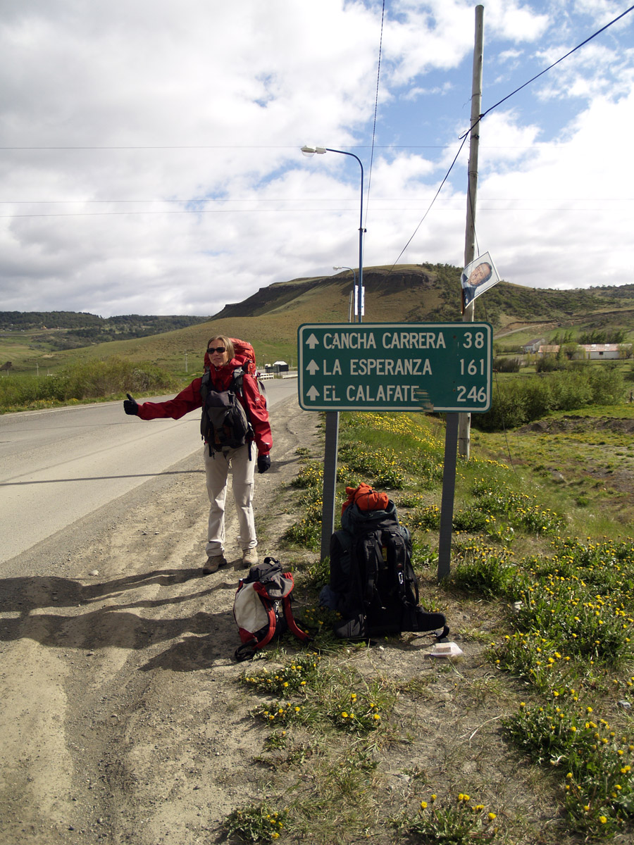 Nous marchons donc jusqu’à la sortie du village et commençons à tendre le pouce. Il y a pas mal de circulation, et au bout de 5 km environ, une voiture s’arrête et nous dépose à la prochaine intersection, à 5 km de là. Ici, un vieux pickup Silverado 3 vitesses (du jamais vu pour nous…) s’arrête et le papi qui conduit nous emmène jusqu’à Rio Turbio, en Argentine. Il nous attend même pour les formalités douanières. Seulement, une fois au village, il nous demande des sous (il nous demande si « on n’a rien à donner au vieux »). Ça, on ne l’avait pas prévu, hé hé… Ça nous dérange vraiment, après tout, on ne fait pas du stop pour payer le chauffeur, hein, mais on se sent un peu obligé, alors on lui donne 10 pesos argentins, juste pour dire. Mais quand même, on n’est pas content ! Nous entamons ensuite la traversée du village à pied pour trouver un nouveau chauffeur. Là, quelqu’un nous prend et nous dépose à 3 ou 4 km, à l’entrée de Rio Turbio. Et c’est reparti à la recherche d’un autre taxi, mais là, il nous faut du longue distance, car il n’y a absolument rien entre ici et un petit bled appelé La Esperanza, à 150 km. Au bout d’une petite demi-heure, une voiture s’arrête avec à son bord deux jeunes Argentins qui vont à Rio Gallegos. C’est parfait, La Esperanza est sur leur route, ils vont nous y déposer. Du coup, nous avons droit à deux heures de musique « locale » genre sound system, un mélange bizarre de trucs latinos, vieillots ou style Manu Chao, selon les morceaux. Ils écoutent tous ça, ici. Une fois à La Esperanza, qui consiste en fait en deux stations services et un hôtel, nous nous engageons sur la route qui mène à El Calafate. Nous décidons de faire une pause pour manger, mais à peine avons-nous posé nos sacs qu’une voiture s’arrête et nous propose de nous emmener à notre destination finale. C’est parfait, nous montons. Tant pis pour les sandwiches, on mangera à l’arrivée ! La route est magnifique et nous profitons du paysage, avec la vue sur le lago Argentino, le plus grand lac d’Argentine, tout en discutant avec notre chauffeur. Il est propriétaire d’une entreprise de matériel électrique et fait pas mal de déplacements dans le coin. Du coup, il nous propose de nous emmener à El Chaltén, notre prochaine destination, si nous sommes prêts à partir vendredi matin, car il s’y rend pour le travail. Cool, même pas besoin de faire du pouce, on a déjà notre chauffeur. Bon, reste à voir s’il sera vraiment au rendez-vous… En attendant, nous arrivons à El Calafate à 13 h 30, avant le bus que nous avons doublé à deux reprises. Et nous avons économisé 230 pesos. On est content !!!