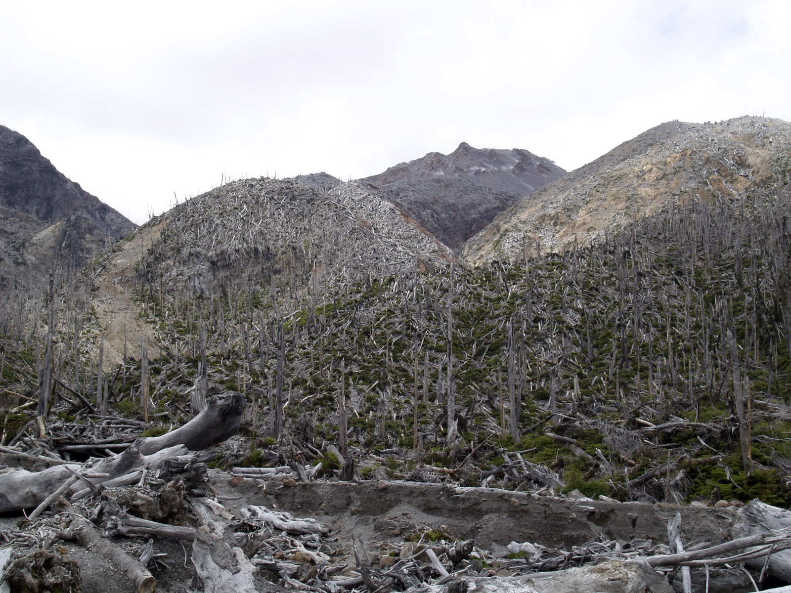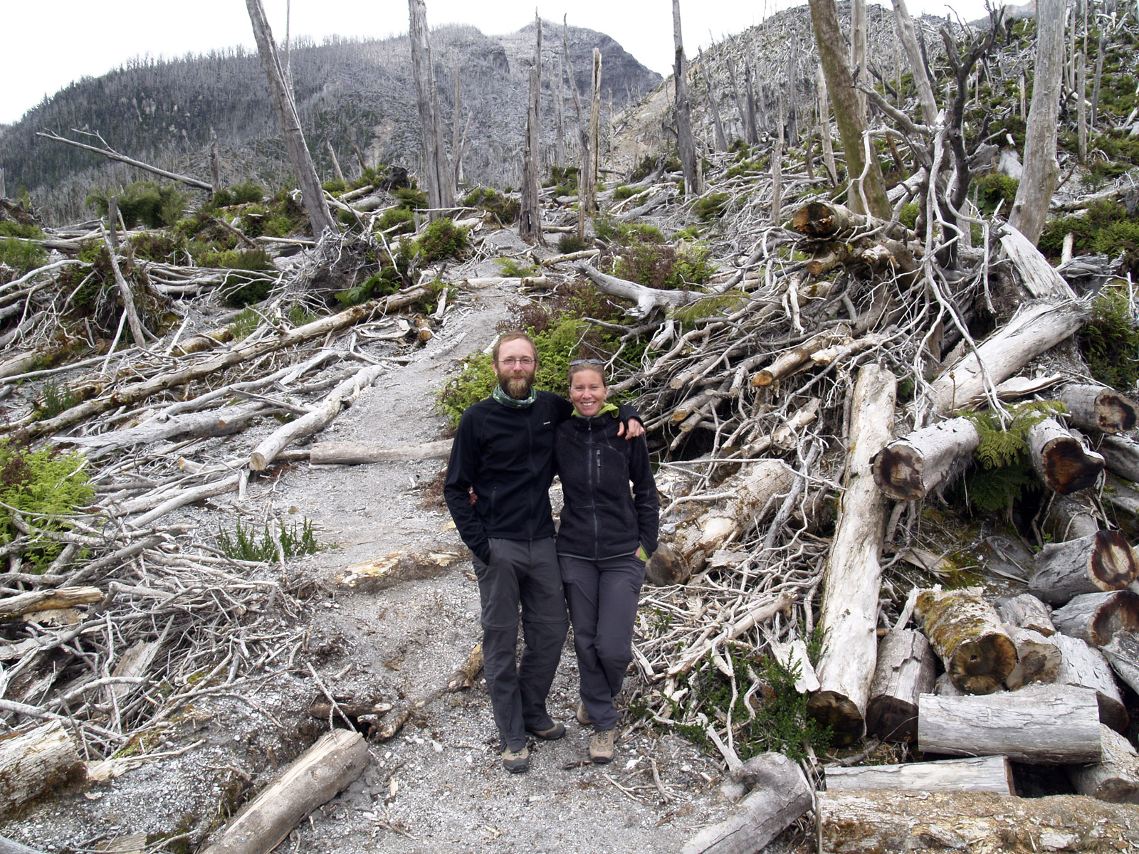 Premier arrêt à la base du volcan Chaitén. C’est impressionnant ! L’éruption a tout brûlé et c’est un paysage désertique qui s’offre à nous, avec en fond, le fameux volcan duquel sort encore de la vapeur. On ne peut pas imaginer cela depuis la route. C’est vraiment beau, même si c’est ce qui a provoqué le malheur des gens d’ici.