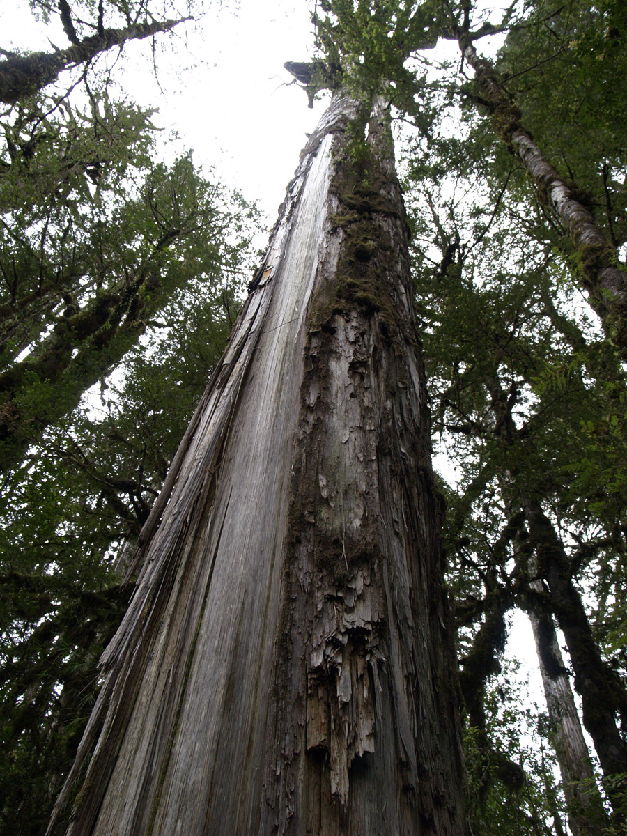 Nous montons ensuite un peu plus au nord dans le parc, pour aller voir des alerces, les fameux arbres du parc argentin que nous n’avons pas pu voir. Ces arbres, de la famille des cyprès, ont été surexploités, et comme ils poussent très lentement (moins de 2 cm par an), ils sont menacés. Ils sont à présent un « monument national du Chili » et sont protégés. Leur coupe est interdite. Certains de ces géants mesurent près de 30 m de haut et sont vieux de 3 000 à 4 000 ans. Le sentier nous permet d’en voir quelques spécimens.