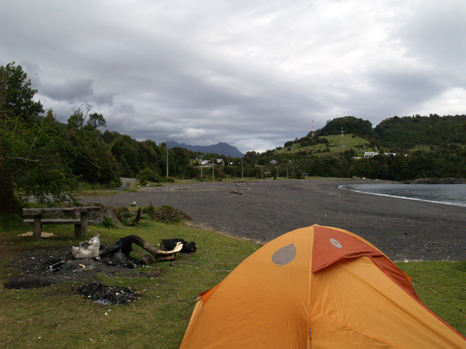 Comme nous ne voulons pas rentrer à Chaitén et ne rien faire pendant deux jours, Nicholas nous dépose à la plage de Santa Barbara, à 11 km de la ville, où il y a un camping gratuit. Et demain, nous rentrerons à pied à Chaitén, cela nous occupera la journée. En fait, l’emplacement de camping se trouve sur le Sendero de Chile. Il s’agit d’un projet de sentier de randonnée qui doit traverser tout le pays. Ici, le projet a été abandonné depuis l’éruption, on ne sait pas s’il sera repris ou non. Toujours est-il que les emplacements de camping, les tables de pique-nique, et même les sanitaires, le tout gratuit, sont bien là, au bord de la plage. Ce serait vraiment idyllique si le projet avait été poursuivi, parce que là, c’est un peu négligé. En fait, les emplacements de camping, ça va à peu près, mais les sanitaires sont inutilisables, les toilettes sont bouchées et débordent, il y a une fuite énorme, tout baigne dans l’eau, bref, c’est dégueu… Nous sommes un peu dégoûtés, parce que c’est un super projet et qu’il y a toutes les installations. Il y a même des douches et de quoi laver le linge !