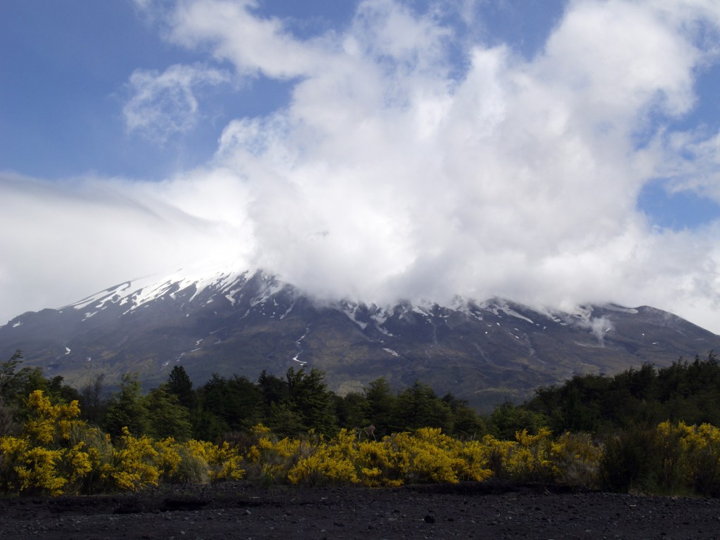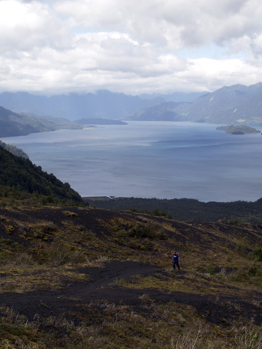 Du coup, nous prenons le temps de manger, au pied du volcan Osorno, qui a l’air de vouloir se découvrir. Ah oui, j’ai oublié de dire que ce matin, en partant, il pleuvait comme jamais, mais qu’une fois arrivés à Petrohué, les nuages ont commencé à se dissiper, et là, on ne voit pas encore tout à fait le volcan, mais presque. Après le repas, nous décidons d’avancer sur le seul sentier ouvert, celui que nous vouions faire demain, et de voir si nous croisons l’autre. Finalement, nous montons autant que possible en fonction de l’heure, sans croiser aucun autre sentier, et profitons d’un paysage volcanique magnifique et de la vue sur le lac Todos los Santos et le fameux volcan, qui daigne se découvrir en fin de journée. Et le moral est revenu, avec le soleil.