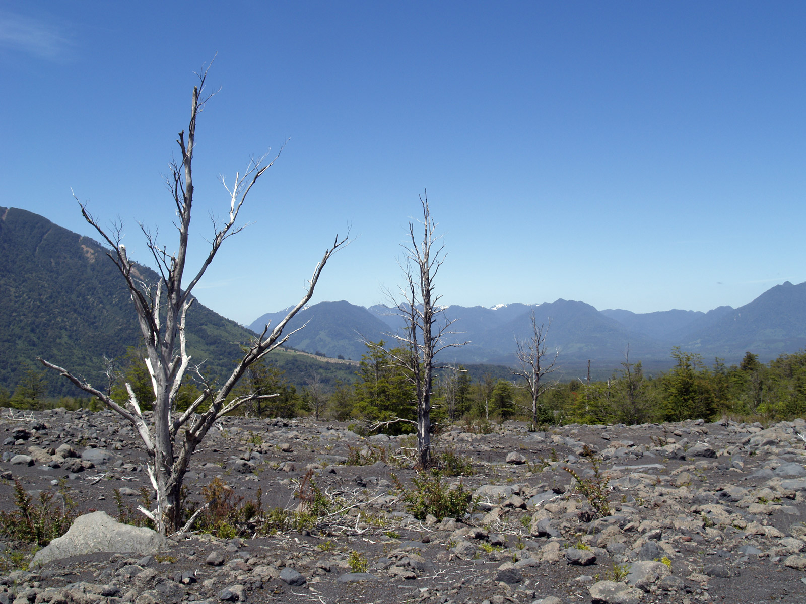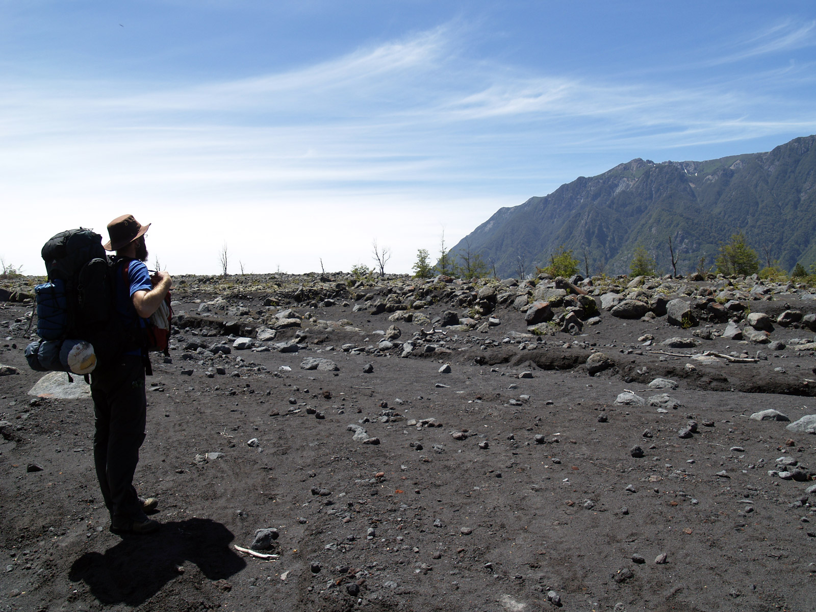 Nous voilà partis pour 6 km avec les sacs à dos. Mais le sentier vaut la peine. Le temps étant dégagé, nous avons une vue magnifique sur les trois volcans qui nous entourent. Nous traversons parfois des bois, parfois des étendues calcinées. C’est vraiment beau !