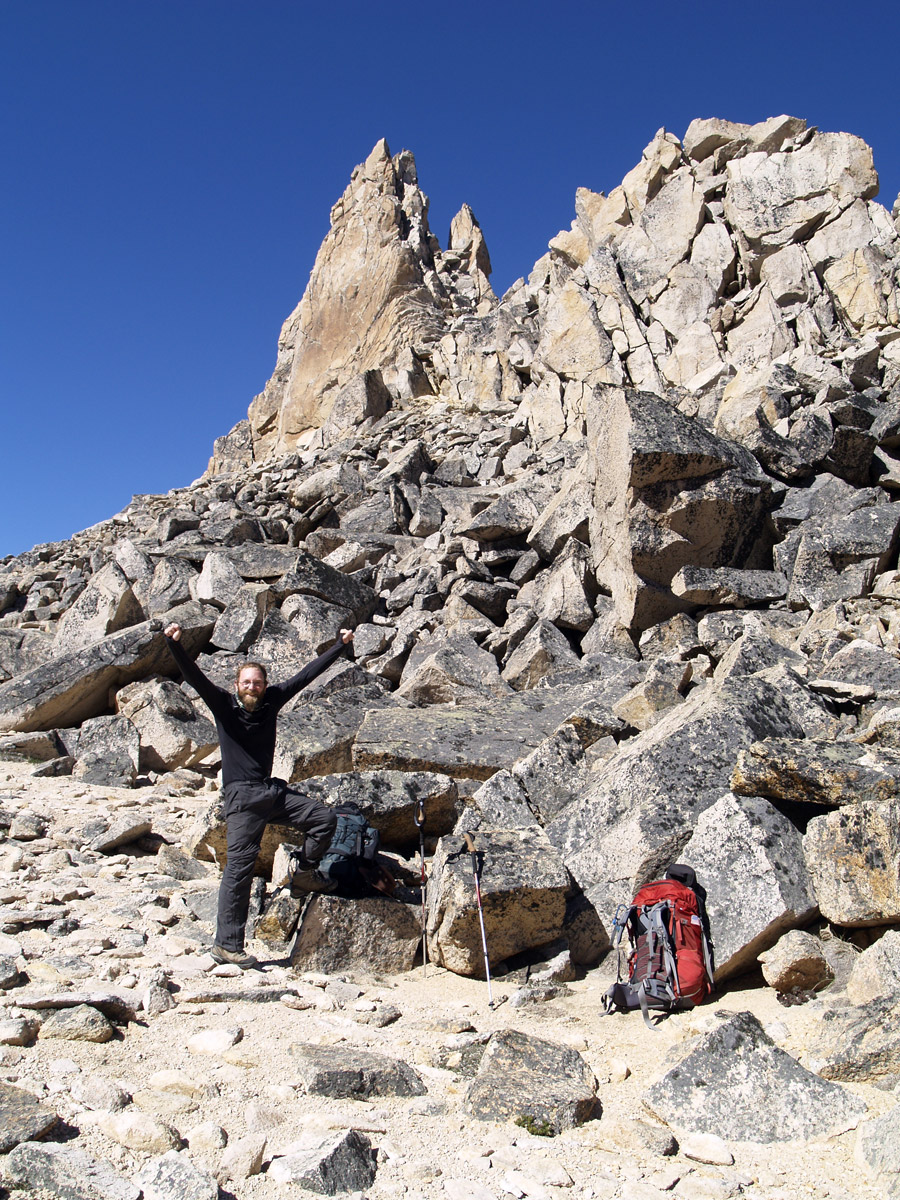 En arrivant au sommet, nous retrouvons la lumière, la chaleur, et nous distinguons au loin le refuge Jakob, notre destination finale. La descente est encore une fois aussi difficile que la montée, voire plus, et nous sommes bien contents de retrouver de la terre et non de la roche au bout d’une demi-heure. Il fait encore jour et nous approchons du but. Il ne nous reste plus qu’à traverser la rivière, et à planter la tente. Bien sûr, cela ne se fait pas sans une dernière difficulté, et puisque nous sommes en période de fonte des neiges, nous marchons littéralement dans la boue. Comme en plus nous sommes un peu pressés et fatigués, nous ne sommes plus aussi attentifs, et je me retrouve bien vite sur les fesses, dans la bouette.