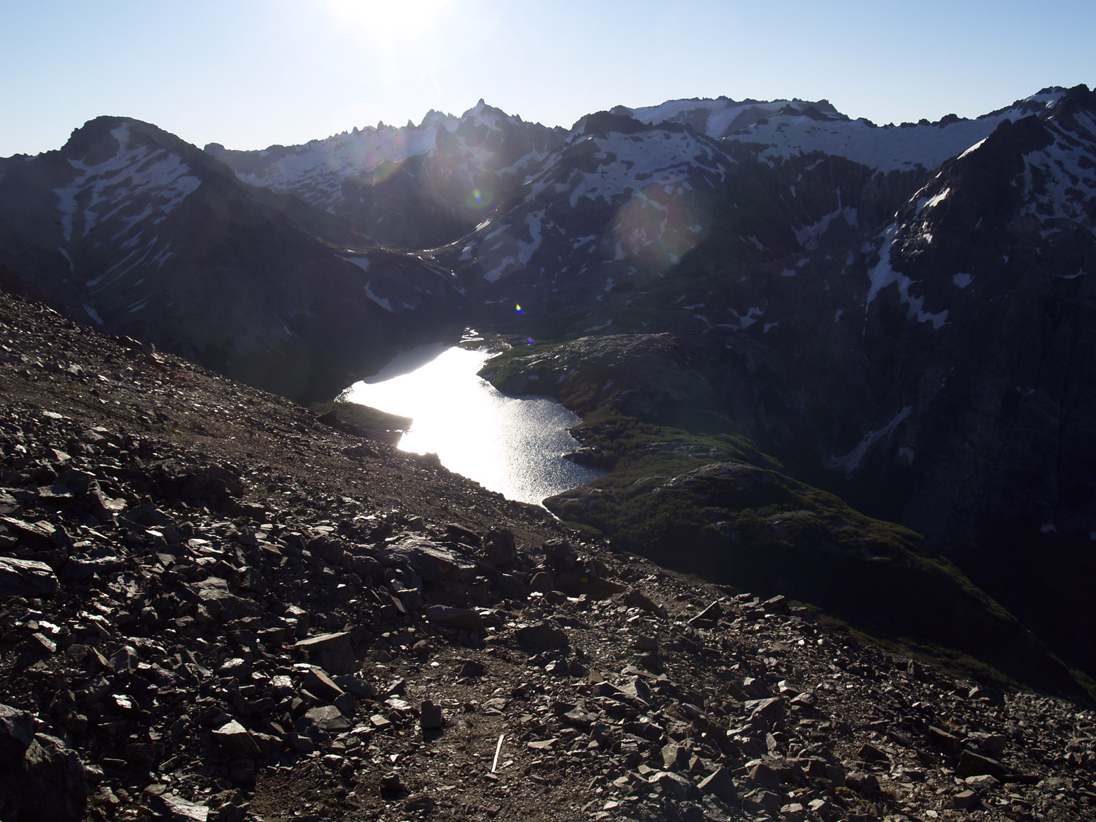 Nous avons donc rejoint la crête de la montagne, et nous nous apprêtons maintenant à redescendre. Ben oui, sinon, il n’y a pas d’intérêt. Nous entamons donc une descente bien plus technique que nous pensions, là encore. Franchement, Marie, merci pour les bâtons de marche. Ils nous servent vraiment beaucoup depuis le début du voyage ! Nous avons une vue splendide sur la vallée en contrebas, mais il nous faut un certain temps pour l’atteindre, vu la pente. C’est limite dangereux, parfois, et nous chutons à plusieurs reprises. Une fois en bas, nous nous attendons à tomber sur la zone de camping assez rapidement. Nous retrouvons de la végétation, et marchons un bon bout de temps. Mais pas de camping. Nous continuons et arrivons bientôt à une nouvelle ascension, la végétation se fait de plus en plus rare, et nous sommes de nouveau dans la roche. Bizarre. Après avoir relu le guide, nous nous rendons compte que nous avons passé le camping. Je croyais qu’il s’agissait d’un campement officiel, bien indiqué, comme le disait le guide. Il n’en est rien et c’était en fait une zone boisée dans laquelle nous pouvions planter la tente facilement. En attendant, nous sommes face à un dilemme : une nouvelle ascension de 400 m se présente devant nous, avec bien sûr la descente qui suit, et impossibilité de camper avant d’être en bas, soit au refuge suivant. Il est déjà 19 h 30. Nous devons faire un choix : monter et aller jusqu’au refuge, mais nous ne savons pas exactement pour combien de temps nous en avons, ou rebrousser chemin. Nous choisissons d’avancer, impossible psychologiquement de redescendre ce que nous avons déjà monté et de le remonter demain. Alors nous grimpons, et profitons de la vue du cerro Catedral derrière nous. Encore une ascension bien technique dans la roche instable, avec un final quasiment à la verticale, dans la neige et au froid, à l’ombre.