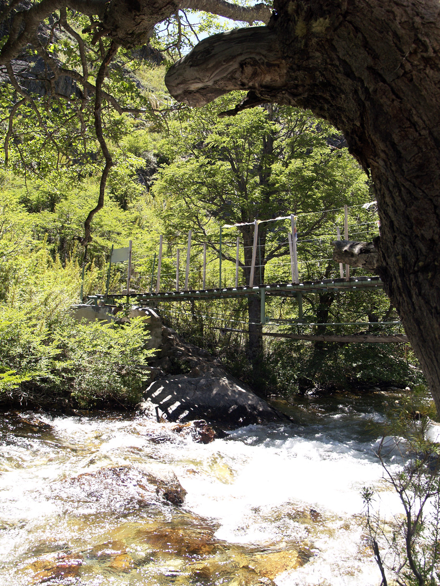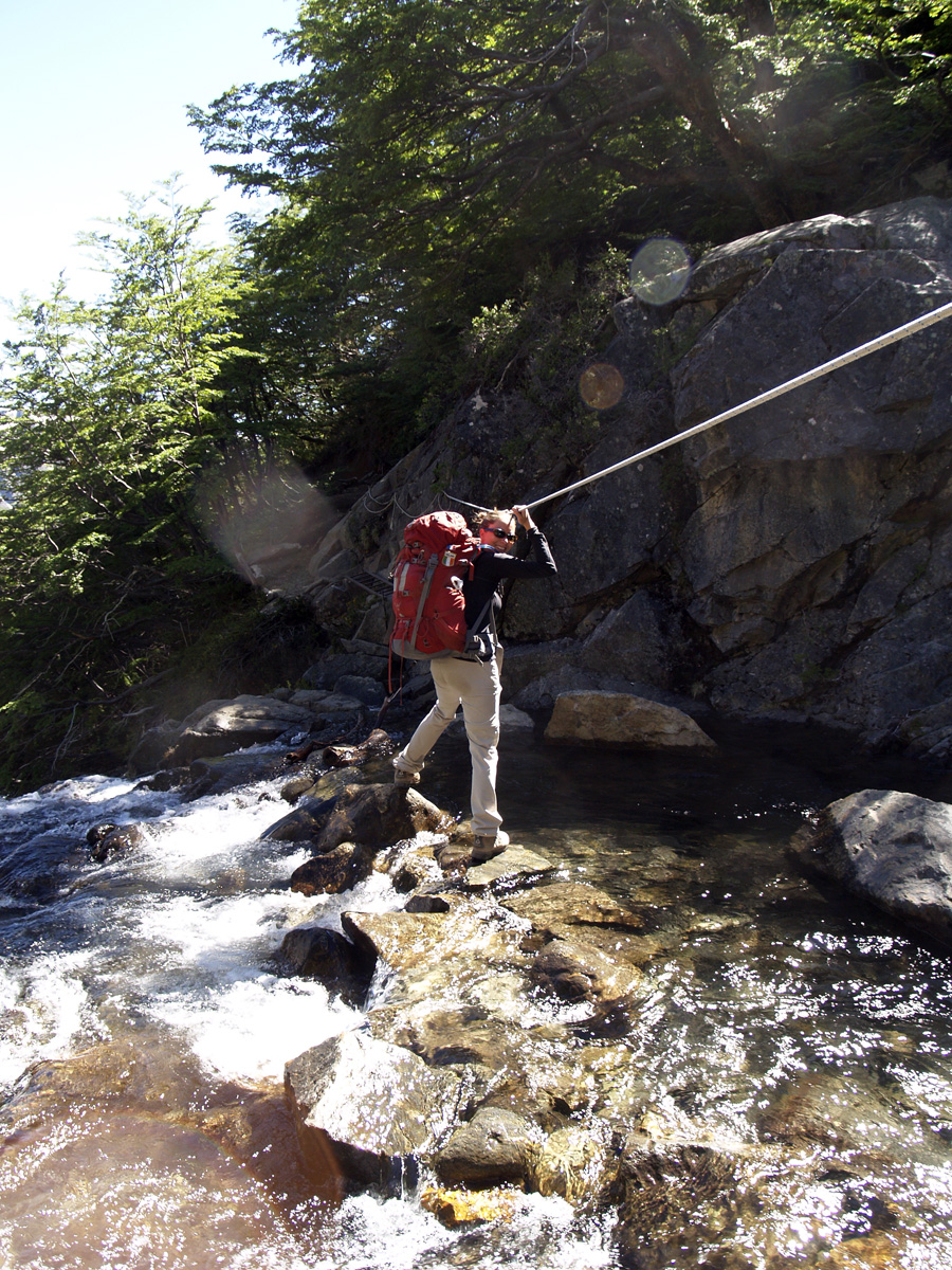 La nuit fût bonne et nous nous réveillons à 8 h 30 sous un ciel bleu et un grand soleil. Ça commence bien. Nous déjeunons, remballons nos affaires et repartons pour Bariloche. 15 km de sentiers nous attendent, suivis de 6 kilomètres sur la route de gravier avant de retrouver la route sur laquelle passent les bus. Le trajet se passe pour la majorité dans les bois, et nous traversons de nombreux cours d’eau. Stéphane tombe dans la boue au départ (ben oui, y en faut pour tout le monde…), puis nous croisons quelques difficultés, comme le passage à gué suspendus à une corde. C’est plutôt rigolo, et beaucoup moins technique qu’hier. Cependant, le début est tout de même assez pénible pour les genoux, puisqu’il s’agit d’une grosse descente de 400 m de dénivelé.