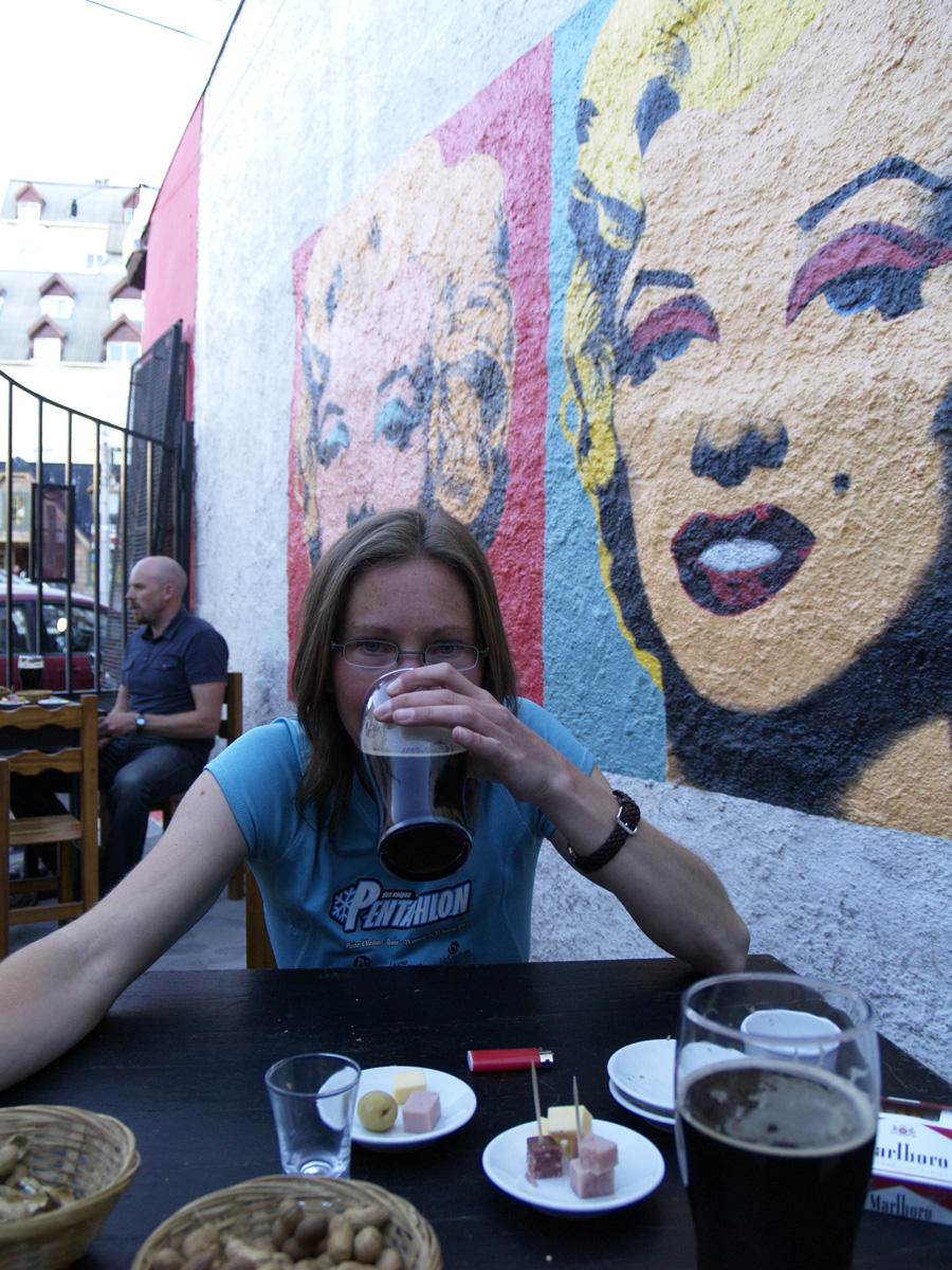Finalement, l’auberge où nous nous retrouvons est vraiment sympa, et surtout très calme, ce qui nous plaît. Nous nous y sentons bien. Pour nous récompenser de nos efforts, nous décidons d’aller prendre une bière avant d’aller faire les courses pour le repas de ce soir. Nous demandons au responsable de nous indiquer un bar local sympa, où l’on sert de la bière brassée ici, si possible. Il nous en cite 3, mais ils sont tous fermés (eh oui, il n’est que 19 h…). Nous en trouvons un autre en chemin, qui vend de la bière locale à la pression. En plus, c’est happy hour, et il y a une terrasse bien sympa. Nous apprécions encore plus lorsque la serveuse nous apporte toutes les petites choses à grignoter. En plus, la bière (Manusch) est vraiment bonne. Finalement, nous en buvons deux. Cela vous étonne ?