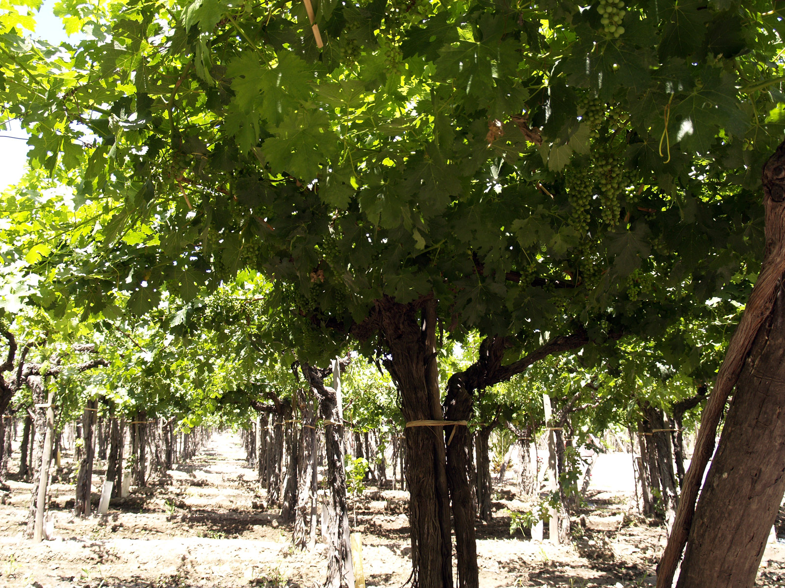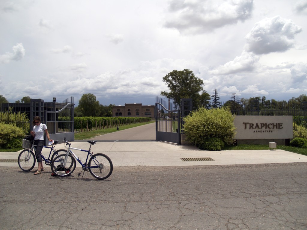 Après deux heures sur place, nous remontons sur notre vélo pour poursuivre notre tour. Il n’y a pas que des bodegas à visiter. La région produit aussi de l’huile d’olive et des produits à base de fruits (confitures, etc.), et il y a pas mal de producteurs qui font visiter leur domaine, offrent la dégustation et proposent des repas sur place. Nous, nous avons de quoi pique-niquer, donc nous ne nous attardons pas. D’autant que toutes ces visites sont payantes. Nous cherchons donc un endroit pour nous asseoir et prendre le repas. Ce n’est pas évident, car le village est en travaux et il n’y a pas vraiment de parc pour s’installer. Et puis le village de Maipu, franchement, c’est une rue principale, ultra passante, et quelques petites rues perpendiculaires avec les bodegas, puis plus rien. Finalement, nous nous trouvons un banc à l’ombre et profitons de la pause des ouvriers pour manger presque au calme. En chemin, nous pouvons quand même nous faire une idée de la taille de la propriété Trapiche, devant laquelle nous passons. Et là, c’est une vraie usine, c’est impressionnant. Rien à voir avec la propriété « familiale » que nous venons de voir. Mais le domaine est très joli, on voit que le vin se vend bien…