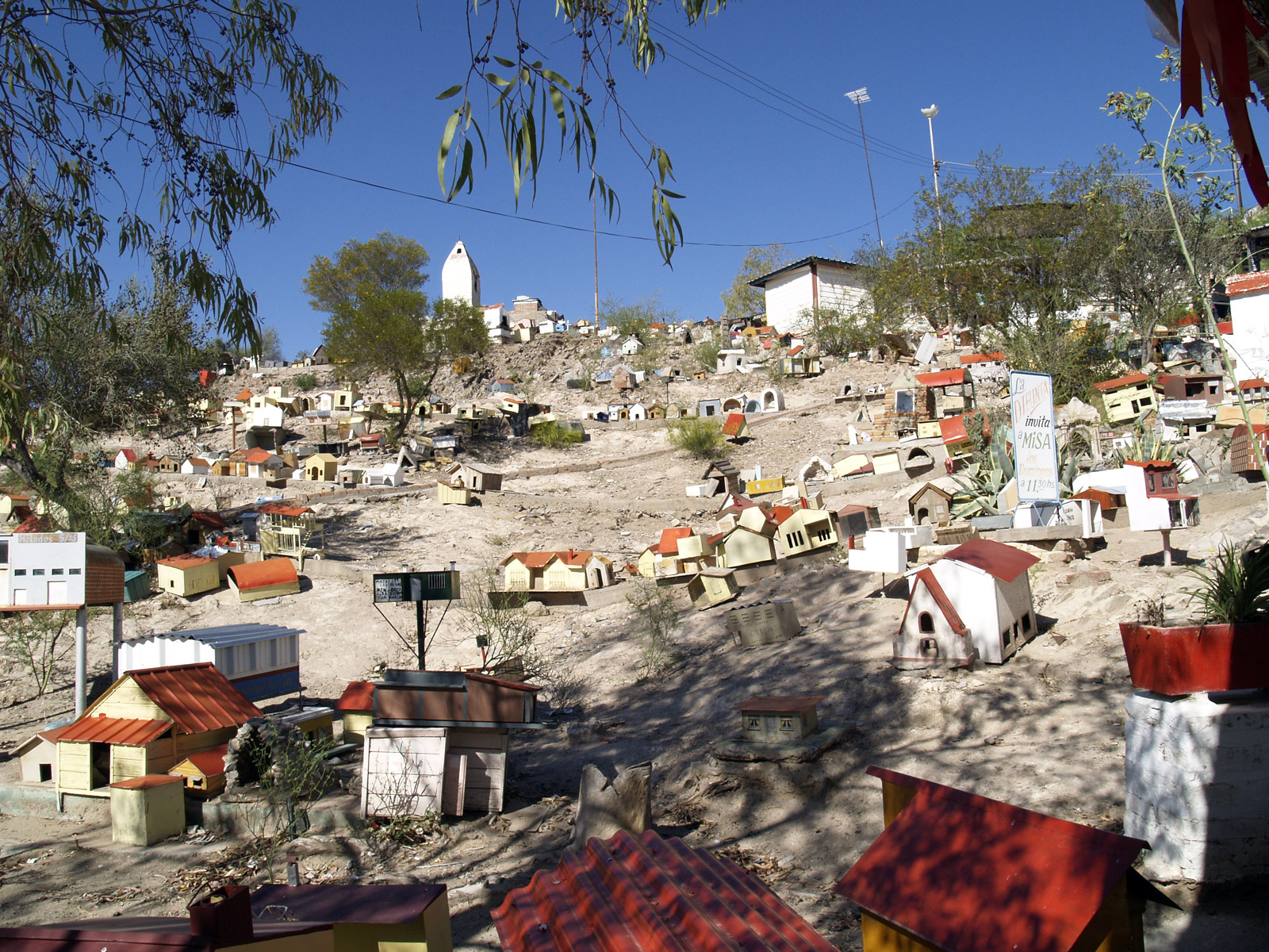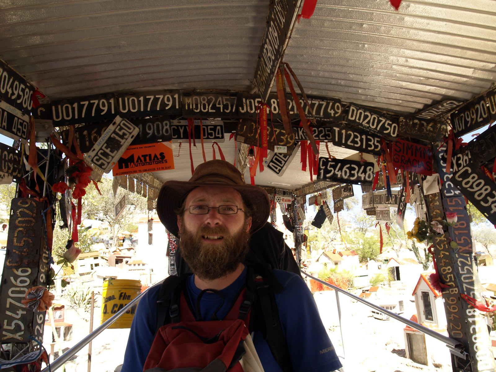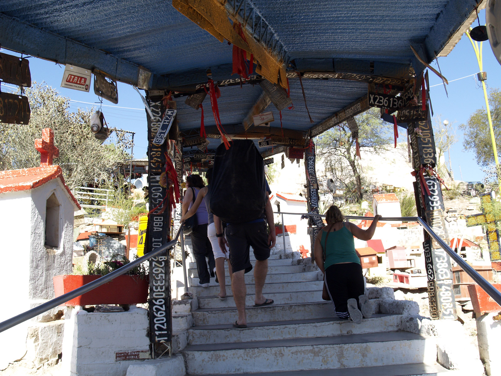 Nous arrivons dans un lieu bien étrange. Effectivement, il y a du monde. Les bus ne cessent de décharger les passagers, et il y a aussi énormément de voitures de particuliers. Au départ, il s’agissait uniquement d’un lieu de recueillement, mais à présent, en raison du nombre de personnes qui se rendent sur place, on trouve un marché d’articles d’artisanat, des restaurants et des cafés. Le tourisme fonctionne donc bien par ici. À part cela, on peut visiter plusieurs chapelles, dans lesquelles les gens viennent se recueillir. L’une d’entre elle serait l’endroit précis où Difunta a été retrouvée. Il y a des plaques de remerciement en métal sur tous les murs. Enfin, on accède au temple par un petit chemin en escaliers (que certaines personnes montent sur les genoux). Là-haut, on allume un cierge, vendu en bas dans toutes les échoppes. Il y a la queue dans les escaliers pour aller se recueillir sur le temple principal. Toute la montée est remplie de diverses choses accrochées par les gens en remerciement de la protection de la « sainte » (elle ne l’est pas officiellement), notamment des plaques d’immatriculation. C’est un peu un garage à ciel ouvert.