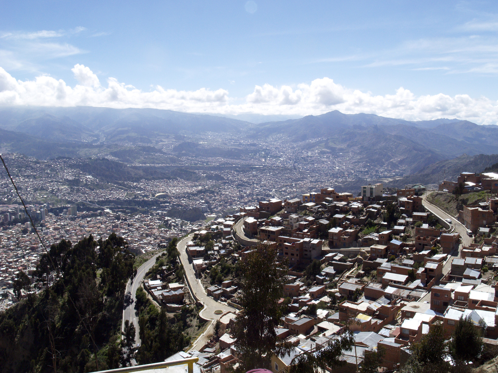 Ce matin, nous avions rendez-vous avec Luz Maria, de l’agence La Paz on foot, pour une excursion de 4 h dans la ville, à pied. Elle nous a fait découvrir les différents secteurs de La Paz. Le principe de tout faire à pied nous a bien plu, et cela nous a permis d’aller dans des coins où nous ne serions pas forcément allés par nous-même. Nous avons commencé l’excursion par El Alto, la ville voisine de La Paz, mais dans les hauteurs, à 4 000 m d’altitude. C’est là que se trouve l’aéroport. La vue de là-haut est à couper le souffle, dans les deux sens du terme. On a beau être habitués à l’altitude, le simple fait de monter quelques marches semble difficile. Mais cela vaut bien la peine, c’est vraiment magnifique ! La ville est dans le creux, entourée de montagnes de toutes parts, certaines enneigées.