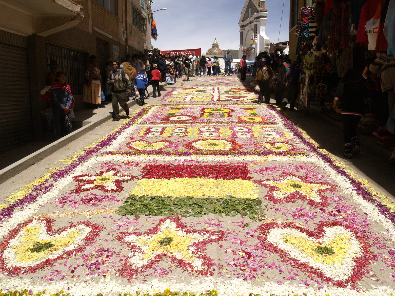 Nous arrivons donc à Copacabana à 13 h. Le trajet en bateau dure une éternité ! Nous allons directement à l’hôtel récupérer nos affaires et nous installer et prendre une douche. Nous ressortons nous promener et nous rendons compte que les festivités pour le carnaval sont sur le point de commencer. Les rues sont recouvertes de dessins en pétales de fleurs, c’est très joli et très appliqué. Finalement, nous n,allons pas manger : les troupes commencent à défiler et nous restons pour admirer les costumes et écouter les fanfares qui suivent chaque groupe. Il s’agit en fait d’une procession qui suit la Vierge, protectrice de la ville, que le prêtre emmène devant la cathédrale. Elle restera exposée là toute la journée. jusqu’à la nuit tombée, les fanfares et les danseurs ne cessent de défiler. Les costumes sont exceptionnels, tous plus brillants les uns que les autres.