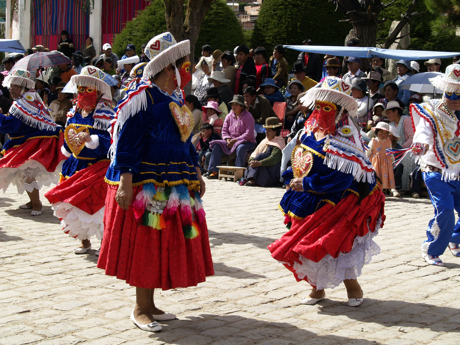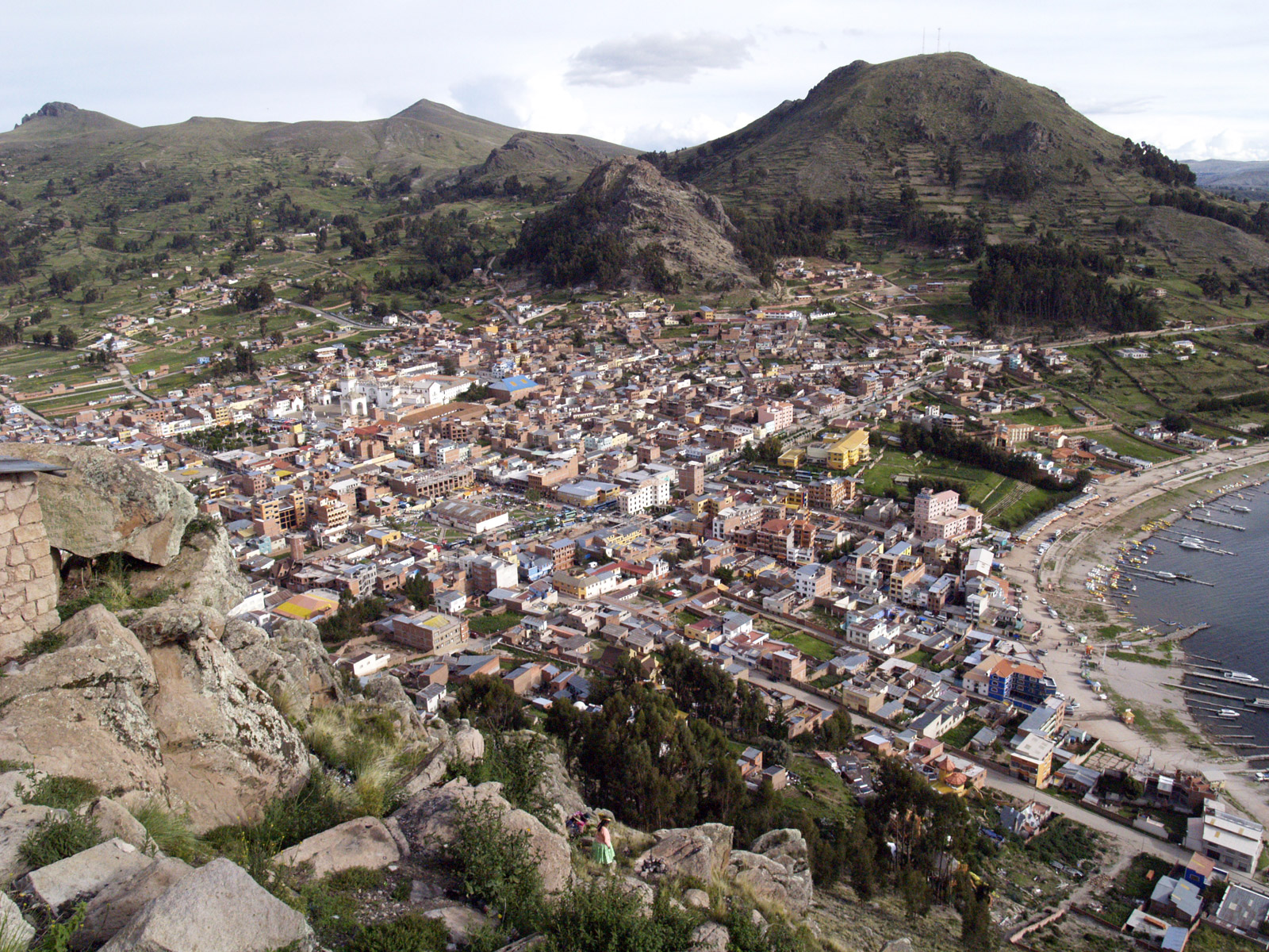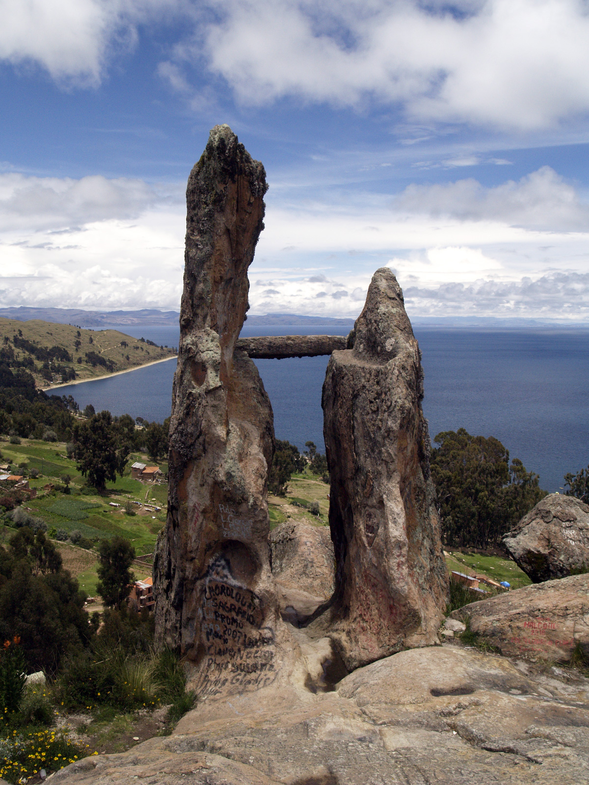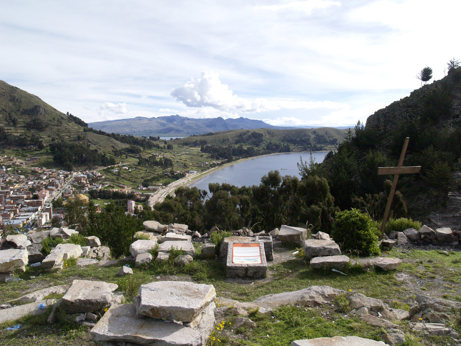 Après une bonne nuit, nous sommes réveillés à 7 h par les premières fanfares. Impossible de comprendre comment ils ont fait pour être debout à cette heure-là, capables de jouer de leur instrument aussi tôt, après un nuit pareille. Nous, qui n’avons pas bu, on aurait bien dormi deux heures de plus. Du coup, nous nous levons et allons visiter les sites pré-incas aux alentours de la ville : horca del Inca (encore une bonne grimpette, j’en peux plus, moi, de monter…), un site d’observation astrologique. On y observait le soleil au solstice d’été. Nous allons ensuite voir, ou essayer de voir, Intikala, el asiento del Inca, soi-disant un autre lieu d’observation astronomique. En fait, on ne discerne rien, le site est grillagé et pas du tout entretenu. De retour en ville, nous croisons quelques fanfares, mais c’est beaucoup plus tranquille qu’hier. On se rend compte que le plus gros de la fête avait lieu le 1er février. Aujourd’hui, quasiment plus de costumes, les musiciens jouent un peu, mais en gros, il s’agit plus de regroupement de gens autour de la place, assis à manger, et surtout à boire. Quelques groupes se succèdent sur les scènes installées. Finalement, heureusement que nous sommes rentrés tôt de l’île hier, nous aurions été déçus de ne voir que les activités d’aujourd’hui. Nous verrons bien ce que le Pérou nous réserve.