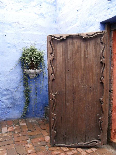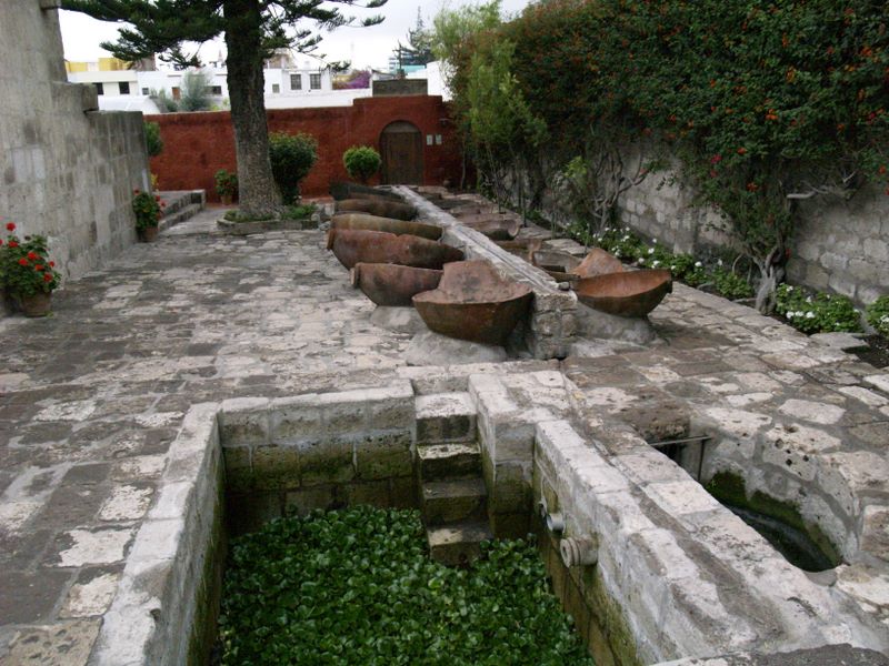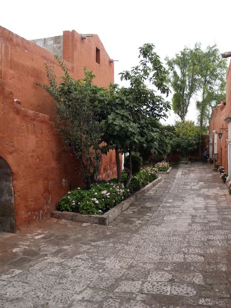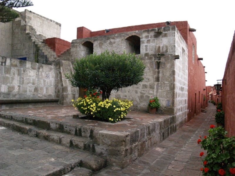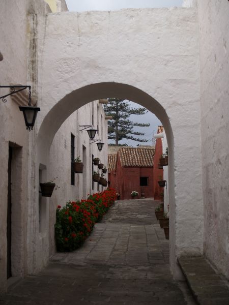 Aujourd’hui, le 7, le temps s’est plus ou moins maintenu jusqu’en fin d’après-midi. Ensuite, déluge. Cela ne nous a pas empêché d’aller le matin à un mirador duquel on était censé voir la ville et le volcan Misti. Bon, pour le volcan, pas de bol, il est complètement dans les nuages. Mais la vue est sympa et les arcades vraiment jolies. Après un tour au marché pour les courses des jours à venir et un resto végétarien le midi, nous sommes allés visiter le couvent Santa Catalina, un immense bâtiment colonial d’un pâté de maison complet.