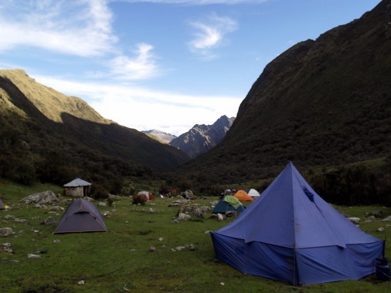Nous avons donc commencé le trekking le 20 février de Vaqueria. De là, nous longeons le Rio Huaripampa pendant 3 heures et arrivons à notre premier campement, à 3870 mètres d’altitude. Le site est très joli. Les hautes montagnes aux alentours sont enneigées, le sol est moelleux et l’herbe est verte. Nous sommes aussi entourés de vaches, de moutons et d’ânes car l’endroit est idéal pour laisser paître les bêtes. Les tentes montées, nous profitons des paysages et allons ensuite prendre un bon repas dans la tente de notre guide. Au menu, soupe de pâtes et plat de résistance à base de riz et de patates, bref le plein de sucres lents pour la journée à venir. Nous nous couchons tôt le ventre bien rempli. Demain, nous nous levons à 5h30 pour 7-8 heures de marche que nous ne ferons pas.