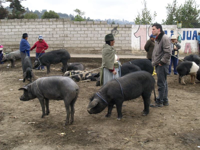 Voulez-vous acheter un porc ? Sachez que le prix de base en Équateur, pour le porc, mais le GROS porc, hein, est de 280 dollars. La dame a eu vite fait de nous le baisser à 250, mais peu importe, nous ne sommes pas intéressés. Un porc dans l’avion, ça fait mauvais genre. Nous sommes donc ici au marché de Saquisili, l’un des plus importants du pays. Il a lieu tous les jeudis, comme nous passons par-là pour notre excursion au volcan Cotopaxi, nous nous sommes arrêtés en chemin. En fait, le marché est composé de cinq marchés distincts, dont l’un animalier, d’où la vente de porcs. Mais on y trouve aussi des moutons, des lamas, des alpacas, c’est assez varié.