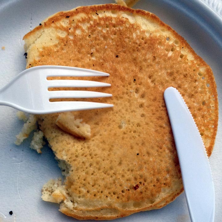 Il y en a dans toute la ville, tous les matins. Et aujourd’hui, la clinique vétérinaire de notre rue (oui, celle qui demande plus de 200 $ pour regarder dans l’œil de Kroutchouk) en organisait un. Nous avons donc profité de l’occasion et sommes allés déguster de très bons (bien qu’un peu gras, hi hi) pancakes-saucisses, offerts et préparés par le personnel de la clinique. Et ma foi, c’était bien agréable, et rigolo de voir ces gens en chapeau de cowboys manger des flapjacks sur un parking. Bref, à refaire l’an prochain. Au moins, ça, ça ne fait de tort à personne (à part à notre balance, peut-être, hi hi) !