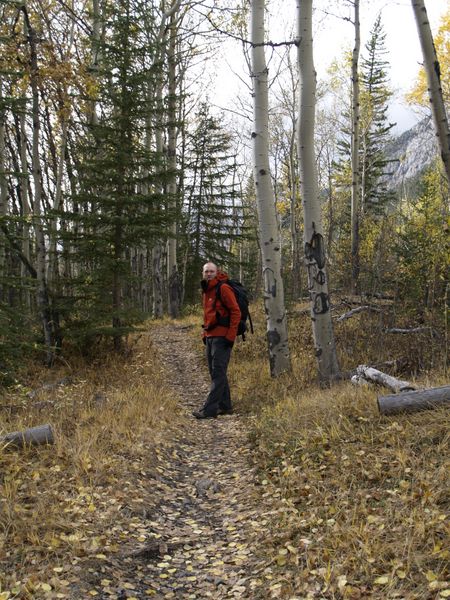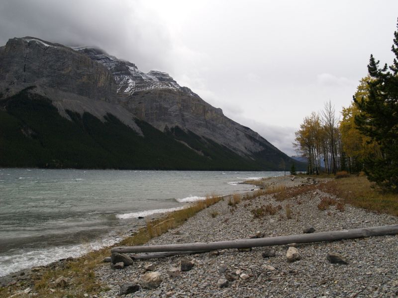 Entre la fin de l’été et le début de l’hiver, nous avons tout de même eu le temps d’aller faire une petite marche de 16 km il y a… trois semaines, dans la parc de Banff. Nous avons découvert le bord du lac Minnewanka, où nous n’étions allés rapidement qu’une fois. Pour les randos là-bas, l’été, c’est un peu compromis. C’est le territoire du grizzli, et du 15 juillet au 15 septembre, il est interdit de s’y rendre à moins de quatre personnes, et le répulsif à ours est obligatoire. Ce qui fait que nous n’avions pas eu l’occasion d’aller nous promener dans ce coin-là. C’est chose faite, et malgré une météo pas terrible, nous en avons tout de même pris plein les yeux. Décidément, les Rocheuses n’ont pas fini de nous émerveiller !