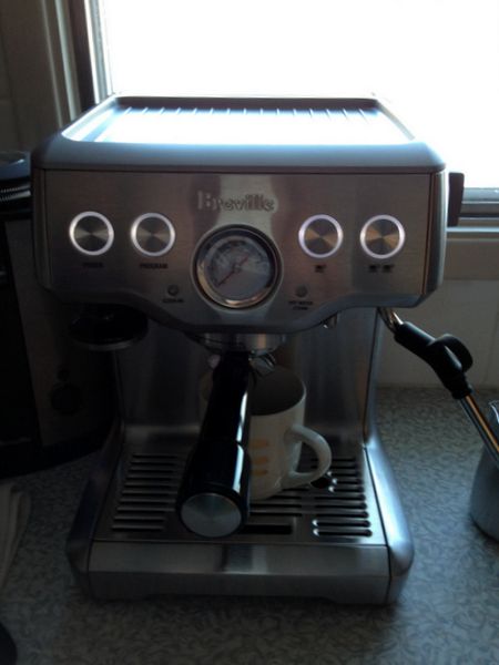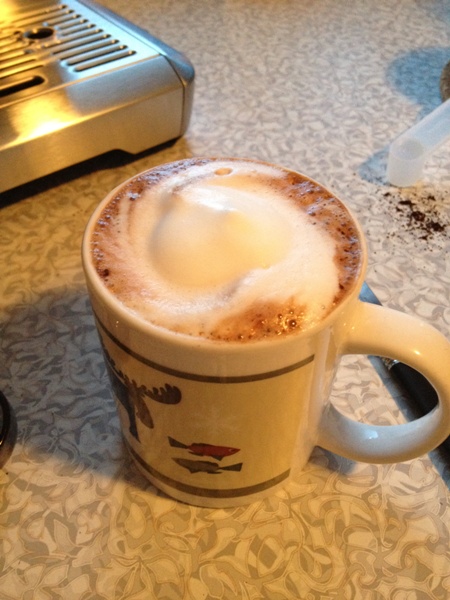 Et pour clore la saga machine à café, voici notre nouvel achat : la Breville Infuser. On a hésité longuement, et on s’est lâché sur le prix, mais ça valait la peine : pas un seul café raté depuis l’acquisition. Du coup, on s’en donne à cœur joie et on s’entraîne à faire mousser le lait. Mieux qu’au Starbuck’s ! La preuve en image encore.