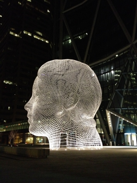 Et pour finir, un point culture : voici la sculpture qui a été installée au pied de la nouvelle tour de Calgary : le Bow building. L’artiste, Jaume Plensa, est Espagnol. Il nous présente « Wonderland ». Vue de nuit.