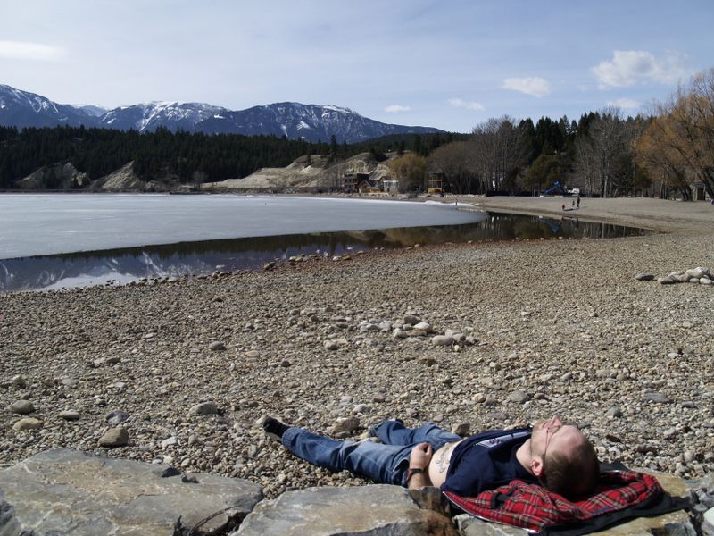 Nous sommes enthousiasmés par les paysages, mais on ne va pas vous le redire encore et encore. Les photos sont là pour ça. La surprise du week-end, par contre, ont été les températures. Entre 15 et 25 degrés pendant quatre jours, on n’avait pas vraiment prévu ça. Du coup, les raquettes sont restées dans la housse : plus de neige sur les sentiers de ce côté des Rocheuses. Et les skis aussi. Là, pour le coup, on aurait pu les sortir, nous sommes même allés jusqu’à la station. Mais on s’est dégonflé quand on a vu l’ambiance là-bas : c’était plutôt farniente en terrasse. Vu que nous avions pratiqué cela en début d’après-midi au bord du lac à Invermere, on s’est contenté de prendre un café et de rentrer tranquillement après.