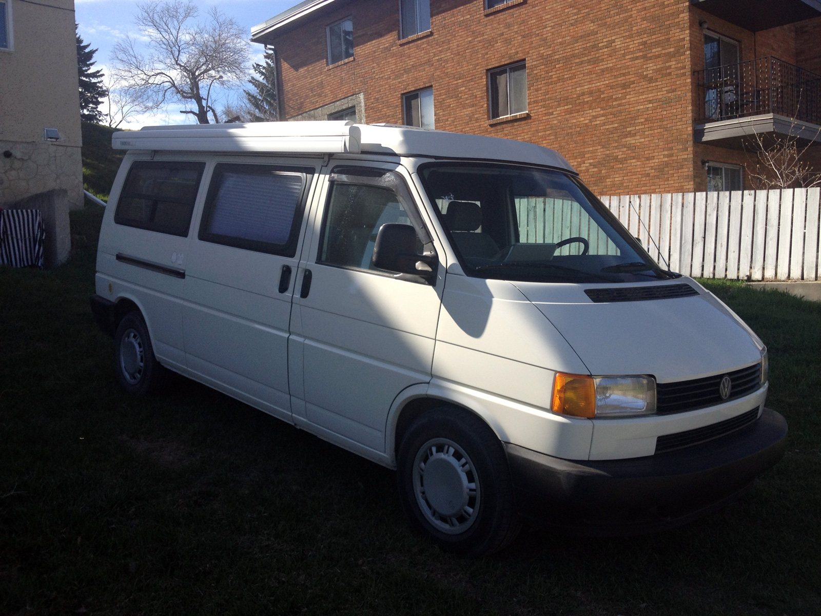 Et oui, vous l’aurez deviné, notre vœu est exaucé depuis ce matin : nous avons trouvé notre bonheur ! Un bel Eurovan tout neuf (enfin, presque…). 1996 seulement, hi hi ! Mais seulement 75 000 km, par contre ! Il est super beau, en excellent état, n’a quasiment jamais été utilisé, bref : on est content !