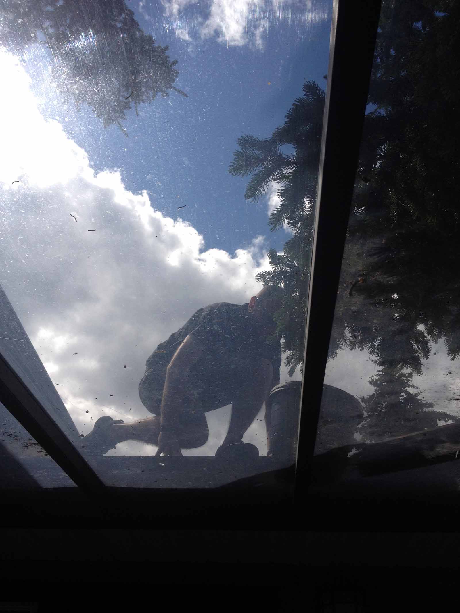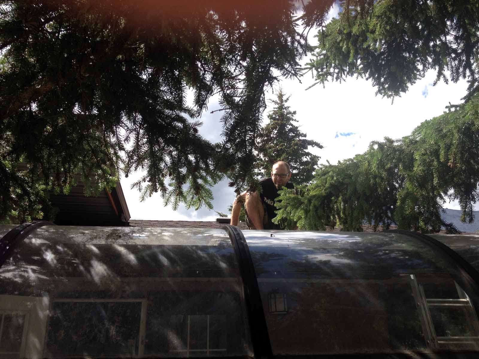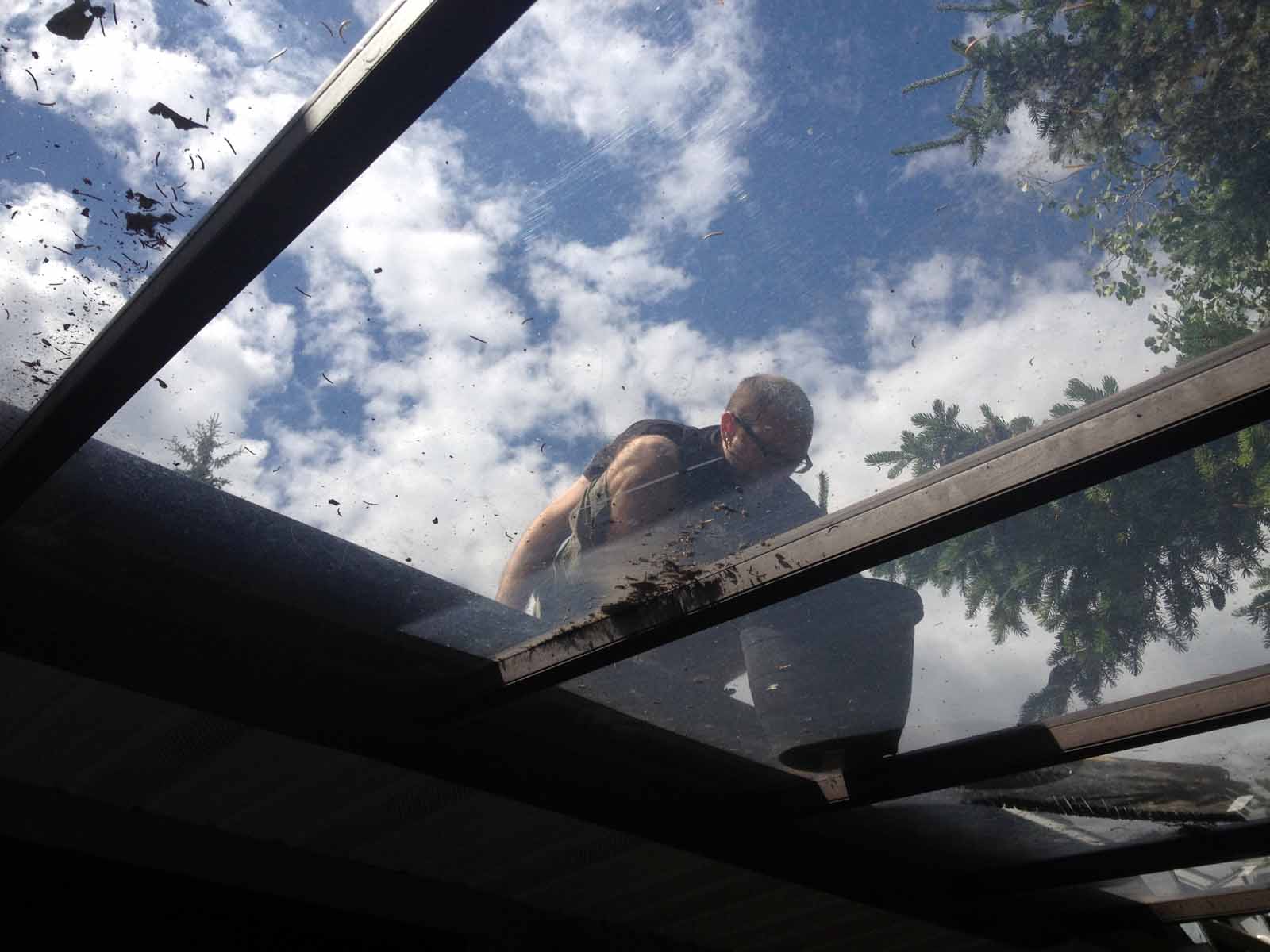 Ce samedi, Mélanie travaillait. Je me suis donc occupé à diverses tâches ménagères. Pour commencer cette journée ensoleillée, je me suis dit qu’il était temps de nettoyer les gouttières. Krista, notre proprio, nous avait prévenus en mai: « La saison des pluie arrive, il faudra peut-être que Stéphane nettoie les gouttières! » La saison des pluies est maintenant passée, j’ai sorti mon échelle (fournie avec la maison), ma petite pelle et mon seau (fournis avec la maison) et je suis monté sur le toit.