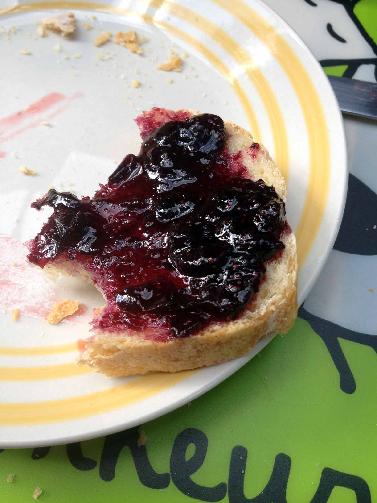 Le petit-déjeuner est copieux. Le pain (sans machine) de Mélanie est excellent. Avec les confitures, c’est un régal!