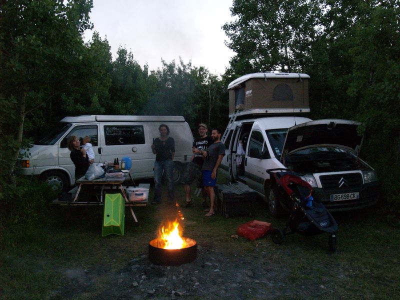 Nous arrivons comme prévu vers 21 h 30 au camping où Sophie est Nico nous ont trouvé un emplacement pour la nuit, en dehors du parc, car il est tout simplement impossible de camper à l’intérieur. Un seul camping est réservable et tous les emplacements sont réservés depuis des semaines. Quant aux autres, ils fonctionnent sur le principe du premier arriver, premier servi. Aucune chance d’avoir un emplacement en arrivant si tard… Mais nous nous en moquons, le camping où nous sommes est très bien, et Nico, en bon Espagnol, nous a négocié un prix ben correk ! Nous passons une fin de soirée bien agréable, à nous retrouver et à faire connaissance avec Geneviève.