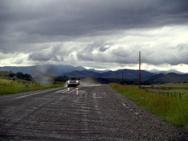 Les paysages sont magnifiques, et dépaysants. Ce ne sont plus des montagnes, mais des collines, et le chemin est bordé de ranches. Nous longeons des rivières, la route est bien jolie. Comme prévu, nous avançons très lentement en raison de la surface non asphaltée. Quand soudain, au bout de 70 km de route de gravelle à une vitesse de 50 km/h, nous nous retrouvons devant une barrière indiquant la fermeture de la route. Impossible de passer. Tout d’un coup, nous regrettons amèrement d’avoir eu l’idée d’emprunter ce chemin. Nous sommes au Canada : lorsqu’une route est fermée, il n’y a pas beaucoup de solutions de rechange. Il faut nous rendre à l’évidence, malheureusement, nous devons faire demi-tour… Nous voilà donc repartis pour 70 km de gravelle en sens inverse, à nous faire doubler par tous les fous en 4×4 qui tractent leur quad avec lequel ils sont allés s’amuser dans les bois tout le week-end, et qui ne prennent même pas la peine de ralentir lorsqu’ils croisent quelqu’un. On a eu peur plus d’une fois d’avoir un éclat sur le pare-brise… Après avoir essuyé trois orages, nous rejoignons finalement la route 22, que nous avions quittée 2 h 30 plus tôt. Retour au point de départ. Il nous reste 240 km à parcourir avant d’arriver à Canmore, et il est 20 h. Nous devrions être arrivés depuis 30 minutes… Nous arrivons finalement à 22 h 30 passé, sous l’orage. Après un super week-end, on peut dire que nous finissons en beauté. Encore une anecdote dont nous rirons dans quelques temps, mais ce soir-là, j’avoue, on l’a pas trouvée drôle !