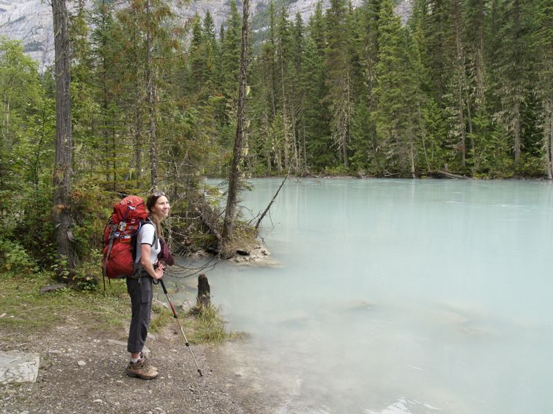 Ça y est, c’est le jour J. Nous partons en matinée pour le parc du mont Robson, à quatre heures de route de Canmore. Passage par la Promenade des Glaciers, que nous commençons à bien connaître, c’est toujours impressionnant. Mais que de touristes. Et encore, nous sommes en semaine. Après un bref arrêt à Jasper pour une gâterie prévue pour le goûter (ahhhhh, les scones à la framboise et au chocolat blanc de la boulangerie Bear Paw… Ça va pas alléger les sacs, ça, hi hi), nous arrivons au parc en début d’après-midi, où nous allons nous enregistrer. Et oui, formalités obligent, bienvenue dans le monde de la randonnée organisée ! Oui, car encore une fois, l’Amérique du Nord, pour la randonnée, il y a à prendre et à laisser. Tout est tellement réglementé que cela devient un vrai parcours du combattant pour aller randonner quelques jours. On perd un peu l’esprit de la marche dans la nature… Par exemple, nous avons dû décaler nos vacances, parce qu’aux dates auxquelles nous voulions aller marcher, il n’y avait plus un seul emplacement de camping réservable, tout était déjà pris ! Du coup, pour être sûrs de pouvoir dormir, on n’a pas le choix des dates, on prend ce qu’il reste. Où alors, on réserve trois mois à l’avance. Autant dire qu’il est impossible de décider au dernier moment d’aller randonner parce qu’il fait beau. Mais il y a tout de même un côté positif à toute cette réglementation : cela limite le nombre de visiteurs (de toute façon, il n’y a que 100 emplacements de camping dans tout le parc). Rien à voir avec les lacs Louise et Moraine au mois d’août, quoi…