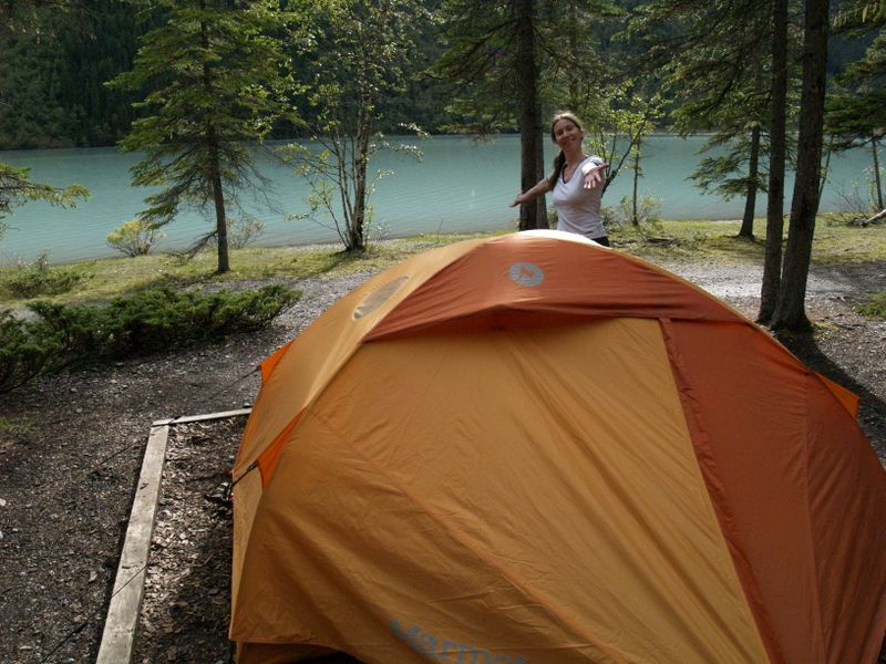 Après avoir attendu assez longtemps que la tente sèche, nous nous engageons sur le sentier pour parcourir les 12 km de montée qui nous attendent aujourd’hui pour rejoindre le camping Marmot, où nous planterons la tente pour les deux prochaines nuits. Effectivement, ça grimpe ! Et on sent bien les kilos sur le dos (heureusement qu’on n’a pas emmené l’apéro, hi hi). En chemin, nous traversons la vallée des 1 000 chutes d’eau (on n’a pas compté, mais il y en a effectivement un paquet), croisons quelques randonneurs et un ou deux écureuils, mais le paysage devient réellement intéressant sur les quelques derniers kilomètres. Une fois sortis du bois, nous longeons la rivière Robson en contrebas et un pierrier sur la gauche : enfin un paysage d’altitude.