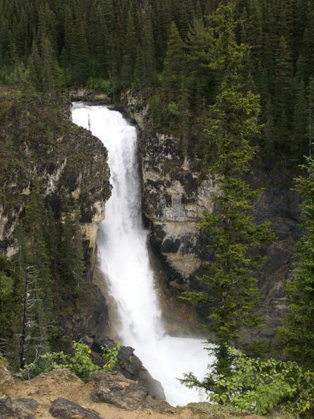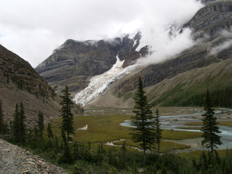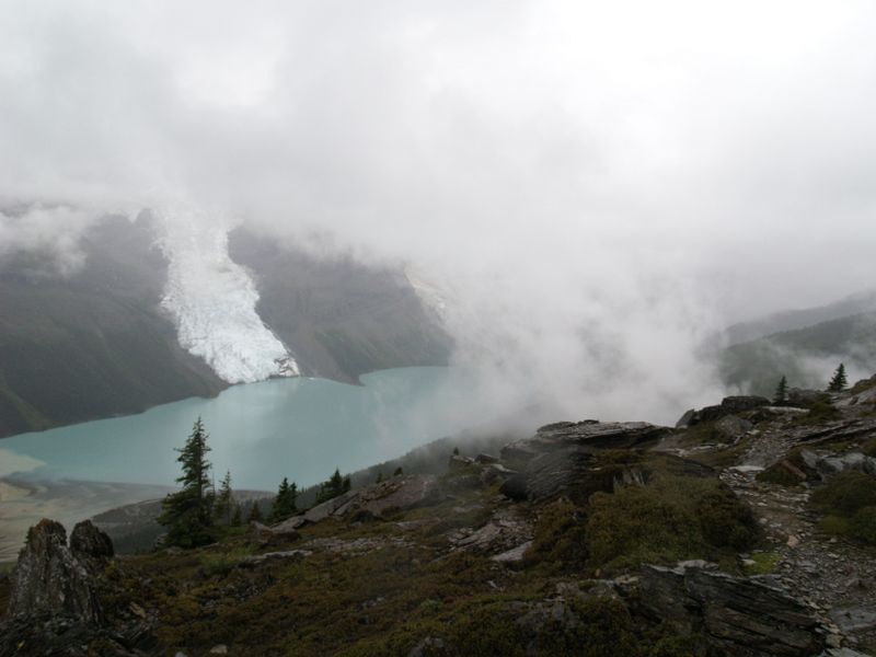 Nous choisissons de faire l’impasse sur le Snowbird pass, décidément sous les nuages et dans le brouillard. Dommage, on nous l’avait fortement conseillé, mais là, cela n’aurait pas donné grand-chose à notre avis. Nous montons donc jusqu’à un pierrier en longeant les Toboggan falls (très jolies, mais sous la pluie, ça rend moins bien…). Ensuite, nous marchons dans le fameux pierrier qui surplombe la vallée et depuis lequel nous devrions avoir une vue imprenable sur les glaciers Mist, Berg et Robson. Malheureusement, on ne voit rien, trop de nuages. En plus, on est trempés ! Et ça ne s’arrête pas. Après avoir atteint le Robson pass, et fait une brève incursion en Alberta, nous redescendons et atteignons de camping le plus éloigné de l’entrée du parc, et où les feux sont permis ! Nous décidons donc de nous arrêter pour manger, et de nous réchauffer au coin du feu. C’est là que nous décidons de rentrer directement au camping par le lac, même si on sait que la soirée risque d’être longue. Finalement, la pluie cesse en soirée et nous pouvons quand même rester dehors. Après avoir dîné tôt, et plus ou moins prévu notre organisation pour le départ du lendemain, nous terminons la soirée par un concours de ricochets sur le lac Berg, gagné haut la main par Stéphane. Comme quoi quand on est loin de tout, on retrouve une âme d’enfant…