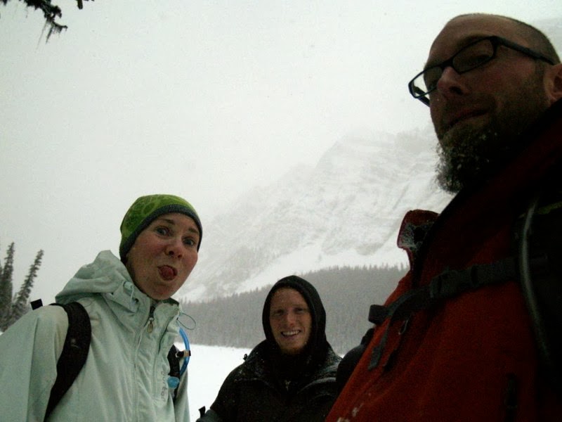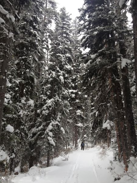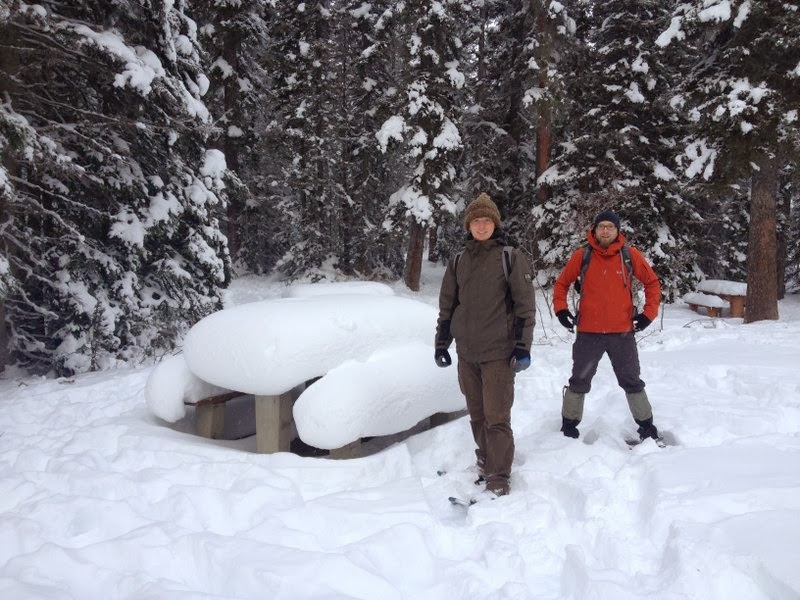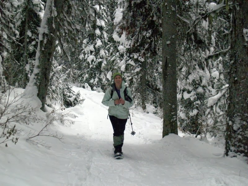 Mais le plus intéressant, c’est plutôt la sortie en raquettes de dimanche, la première de la saison, sur un sentier que nous ne connaissions pas encore, plus utilisé par les skieurs de fond que par les gens en raquettes, d’ailleurs. Nous hébergeons actuellement Steffen, un jeune couchsurfer Allemand qui vient passer deux mois à Canmore pour travailler (il est menuisier) avant de poursuivre son voyage d’un an à l’étranger. Cette sortie lui a donc permis de s’initier aux raquettes, puisque c’était sa première fois. Elle a également permis à Stéphane de tester son cadeau d’anniversaire avant l’heure, avant de le remballer pour le rouvrir le jour J. Il a eu l’air satisfait.