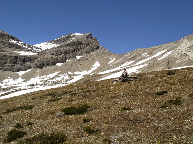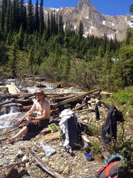 Nous traversons le pré sans croiser un grizzly et continuons l’ascension en longeant le torrent. Le sentier devient plus dur et moins visible. Nous traversons le torrent à plusieurs reprises, parfois sur des pierres, parfois sur un tronc, parfois sur un pont de bois cassé. Et malgré ce pont cassé, il nous faut retraverser. Mais pourquoi ne sommes nous pas toujours restés du côté droit du torrent? Cela nous aurait éviter ce qui va se passer… Les semelles humides, je me pète la gueule et tombe dans le torrent. Me voilà les pieds trempés, les chaussures qui pèsent 10 kgs. Nous profitons donc de cette petite frayeur pour faire un pause, nous allons casser la croûte et nous faire dorer la couenne au soleil. Mes pompes auront peut-être le temps de sécher sous ce soleil de plomb…