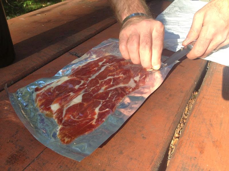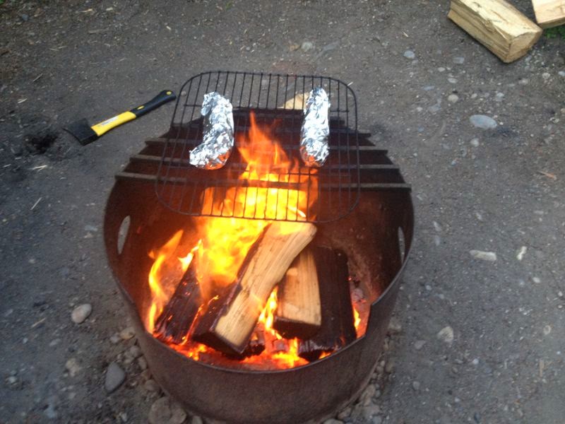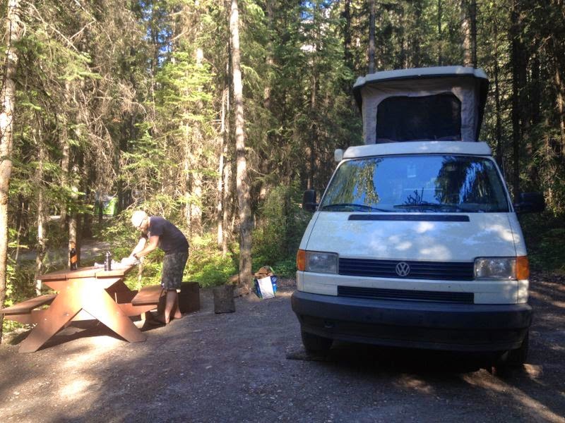Tout est installé, le toit pop-up relevé, le frigo sur le mode propane, la soirée peut commencer avec fuet, jambon ibérique, bonne bière d’Alberta, bon vin argentin pour Mélanie, hot-dogs et bananes farcies au chocolat en dessert. Un régal…