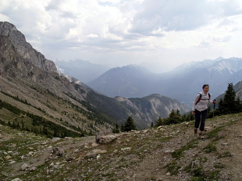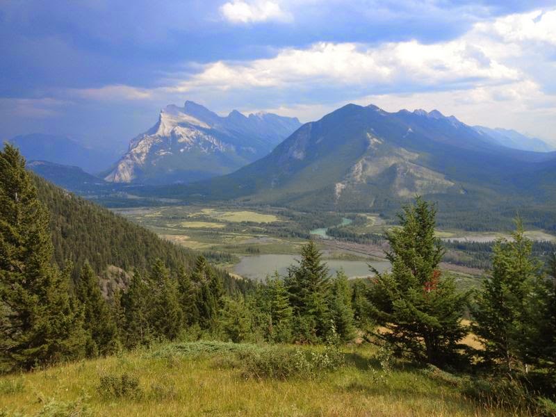 Mais arrêtons de nous plaindre, car entre ces deux parties assez peu réjouissantes, quelle surprise! Le paysage était splendide, et j’avoue que je ne m’attendais pas à cela. Je craignais un peu de voir encore le même genre de paysage que nous avons déjà vu plusieurs fois, mais non. La partie la plus en altitude était impressionnante, avec ses roches verticales suspendues telles des statues, cette vue infinie sur les sommets, encore enneigés pour certains, la diversité des fleurs de montagne et, dans la descente, une vue imprenable sur la rivière Bow, turquoise, les lacs Vermilion et la ville de Banff au loin, protégée comme toujours par le mont Rundle. Époustouflant! Le temps était orageux, ce qui rendait les couleurs encore plus impressionnantes. Malheureusement, cela ne nous a pas aidé à prendre de belles photos. Nous ne sommes pas assez bons pour cela. Voici quelques clichés tout de même, pour vous donner une idée.