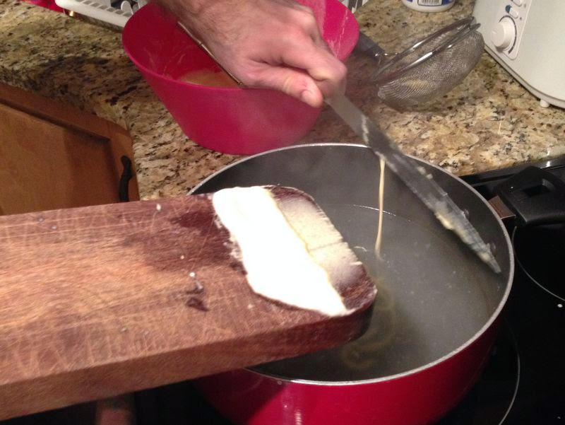 5) Avec le dos d’un couteau, lui aussi préalablement humidifié à l’eau bouillante, couper une « tranche » de 5 mm de pâte maximum et la faire tomber dans la casserole d’eau bouillante. Laisser cuire 2 à 3 min. dans l’eau bouillante, jusqu’à ce que les spaetzle remontent à la surface.