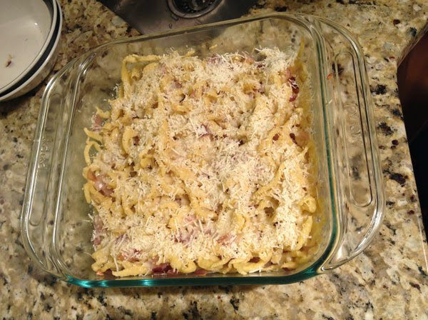 7) Répéter l’opération jusqu’à ce qu’il n’y ait plus de pâte. Mélanger les oignons et les spaetzle. Recouvrir de fromage râpé.