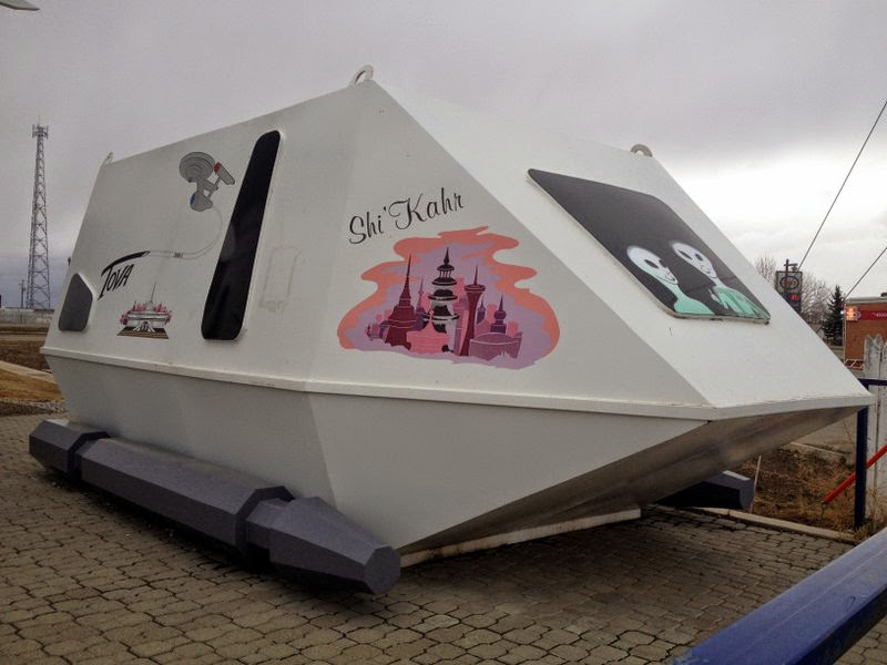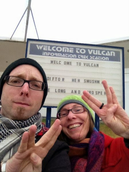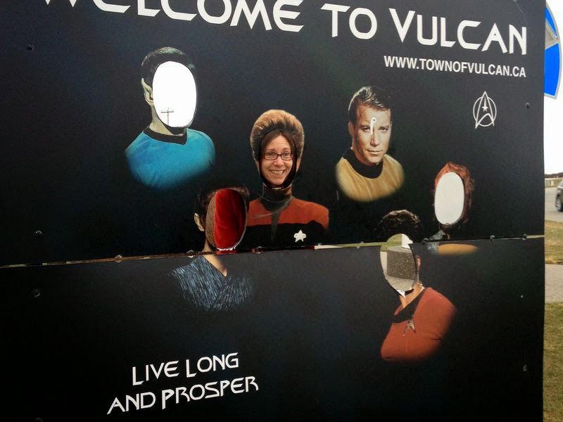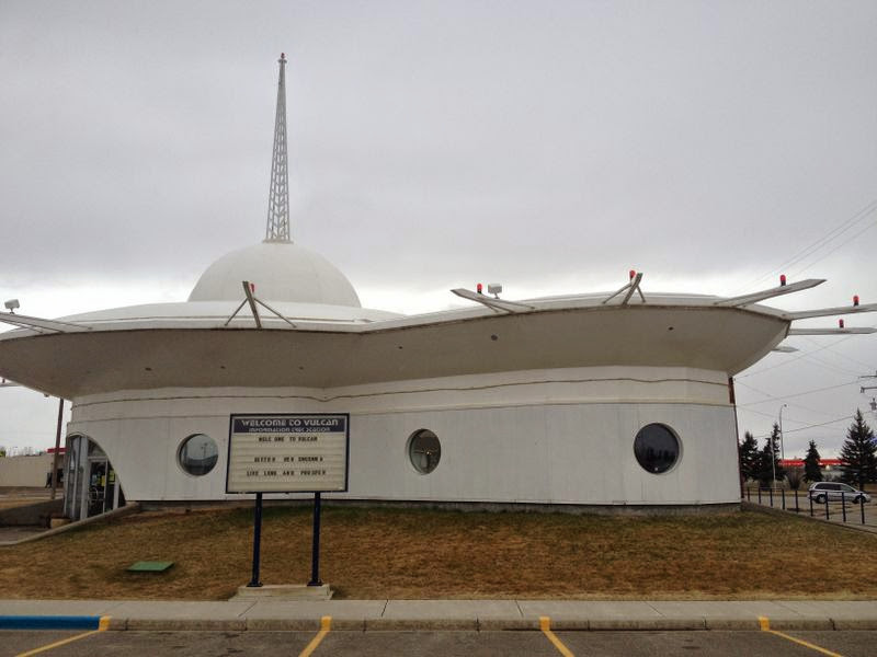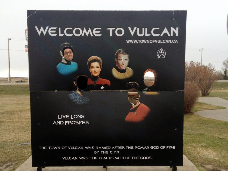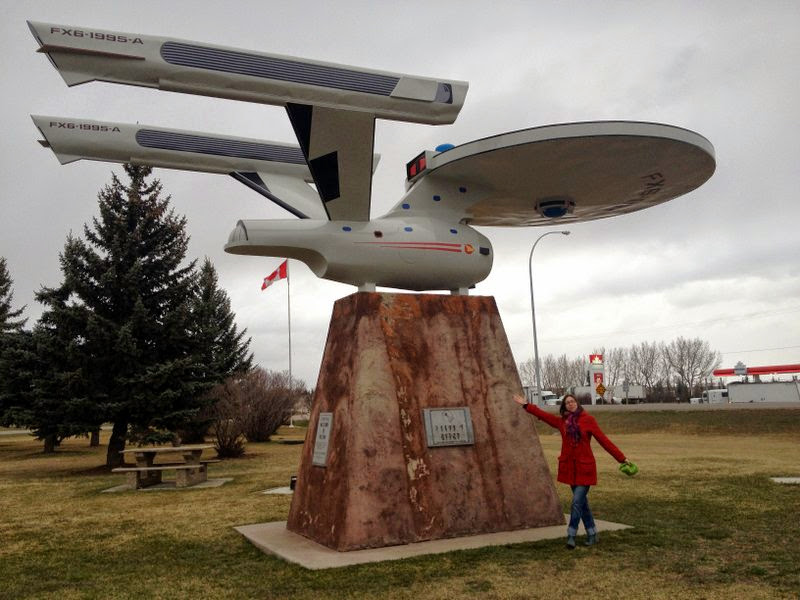 J’insistais depuis longtemps pour aller à Vulcan, et enfin, l’occasion se présentait : ce serait donc notre premier arrêt. Pour l’anecdote, Vulcan, petite ville d’environ 1800 habitants, est « internationalement connue » (hum hum) par les fans de Star Trek (dont nous ne sommes pas), et vit principalement du tourisme (mais l’été seulement, hein, faut pas déconner) lié au célèbre univers, en raison de son nom, similaire à celui de la planète Vulcan (Vulcain, en français) : http://www.townofvulcan.ca. Bref, encore une attraction quétaine digne des plus belles découvertes canadiennes. La ville est citée dans les guides touristiques de l’Alberta, et depuis notre arrivée, je rêvais de m’y rendre. Nous avons essayé d’y envoyer tous les touristes qui sont passés par chez nous, et avons seulement réussi à convaincre Élise et Pierre-Jean l’an dernier. Ils en étaient revenus enchantés et nous avaient raconté à quel point l’expérience avait été enrichissante. Les photos qui suivent leur sont donc dédiées…