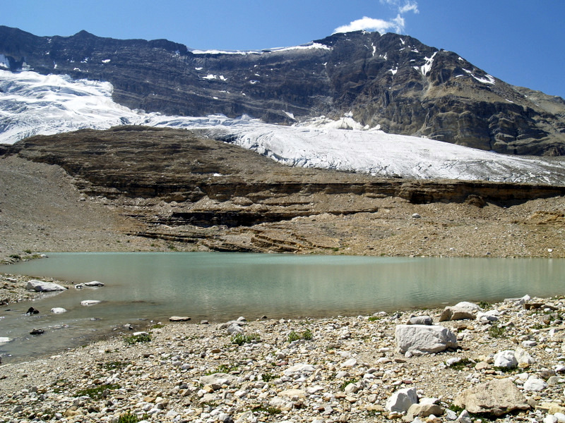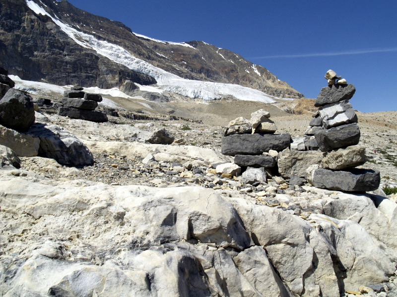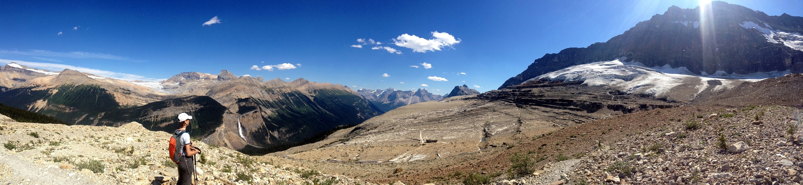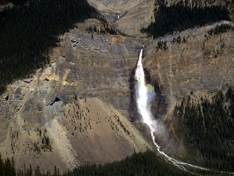Le sentier partait des chutes Takakkaw, que nous avions déjà vues il y a trois ans (déjà…). Nous nous souvenions d’un « minuscule » filet d’eau. C’était bien différent cette fois-ci, car beaucoup plus tôt en saison. Le débit était impressionnant!