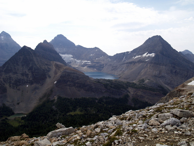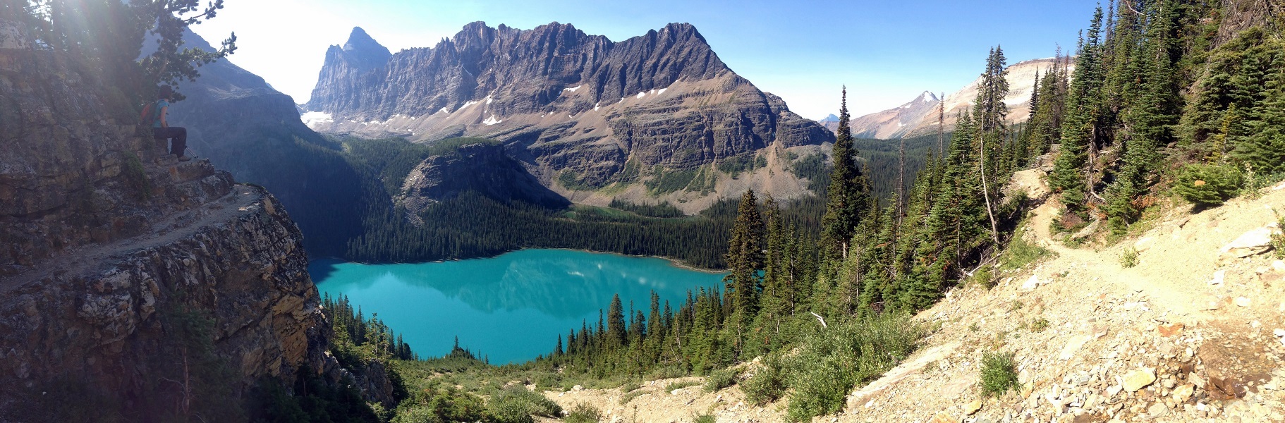 Et après une bonne nuit rythmée par les trains incessants, nous nous sommes rendus au très attendu lac O’hara. Après avoir monté la tente rapido presto, nous nous sommes lancés tête baissée sur le sentier alpin, celui qui fait le tour du lac, mais par en haut, qui nous a fait grimper de plus de 500 m en 1,5 km (aïe aïe aïe, les jambes), qui nous a causé quelques frayeurs (acrophobes, s’abstenir), mais qui nous a offert des points de vue tellement exceptionnels qu’il nous aurait été impossible d’imaginer emprunter un autre chemin.