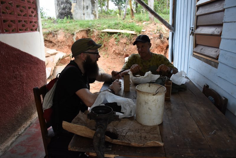 Nous passons trois jours à Viñales. Les touristes sont nombreux dans cette région, pour plusieurs raisons : la géologie et les paysages, la culture (de tabac surtout, un peu de café aussi) et la proximité de la côte nord de l’île et de plages magnifiques. Comme tout le monde, nous avons décidé de profiter de ces trois attraits. Le premier jour, après un ÉNORME petit déjeuner (le premier d’une longue lignée), nous prenons le temps de marcher tranquillement jusqu’à un hôtel situé à l’entrée de la ville, en hauteur, et d’où la vue sur la vallée est imprenable. Pour info, cet hôtel, aux prix horriblement inaccessibles et bien sûr réservé aux touristes les plus fortunés, est le seul endroit où nous avons entendu parler d’une machine acceptant les cartes de crédit! Autrement, à Cuba, tout se paie cash. En chemin, nous rencontrons un gentil monsieur, à l’affût du touriste, qui nous entraîne dans sa « ferme », où il cultive soi-disant du tabac, pour nous montrer comment on fabrique des cigares, et, bien sûr, essayer de nous en vendre.