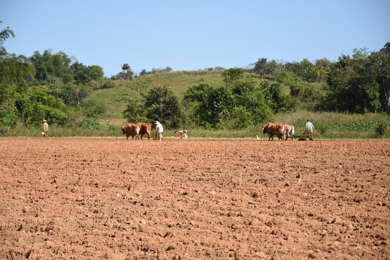 Cela nous prend la demi-journée, et nous rentrons manger chez notre hôtesse avant de partir avec son fils pour un « tour guidé » des environs. C’est à peu près ce que nous avons fait la veille, mais plus loin. Et avec quelqu’un du coin, c’est toujours plus intéressant. Évidemment, c’est très orienté « touriste », donc les arrêts sont très bien choisis, à des endroits stratégiques : l’exploitation de tabac du copain (qui vend ses cigares), le petit bar en pleine cambrousse avec les amis qui jouent du Compay Segundo en prenant les promeneurs à parti (et qui vendent leur CD)… Mais cela nous permet de découvrir la vraie campagne cubaine en nous enfonçons un peu, de voir à quel point les travaux des champs sont encore pénibles à Cuba (nous avons dû voir un seul tracteur de tout notre séjour), et de nous rendre compte de la chance qu’on a, nous, pour qui tout est si facile.
