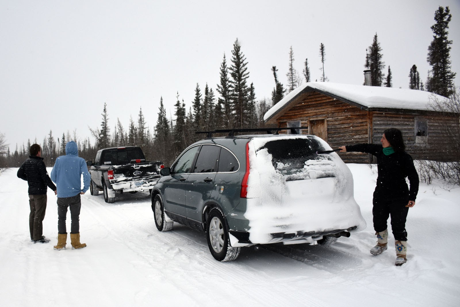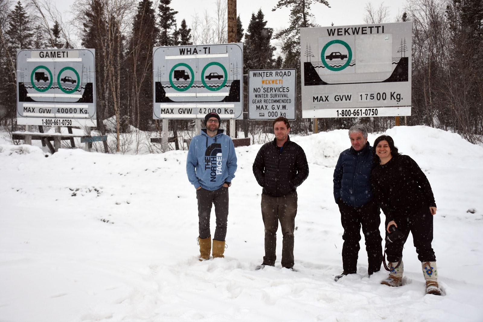 Pour rester dans le thème, nous avons décidé avec nos amis (et collègues) Carole, Yves et André, de prendre la route d’hiver jusque Whatì, une autre collectivité autochtone de 500 habitants située à environ 150 km de Yellowknife, juste pour voir! Nous avons traversé tout Marian Lake (environ 35 km) sur la route de glace. Puis nous nous sommes retrouvés au bout d’une route, au bord du lac La Martre, l’un des plus grand des Territoires du Nord-Ouest. Toute une expérience : du blanc, du blanc, du blanc. Quelques arbres, puis du blanc, du blanc, du blanc. Un peu de gris aussi, parce qu’il neigeait à notre départ. C’était donc manqué pour le bleu translucide de la route de glace, que nous étions venus chercher. Mais le soleil s’est levé au retour, ce qui nous a permis d’admirer ce paysage immense et vierge. Impressionnant!