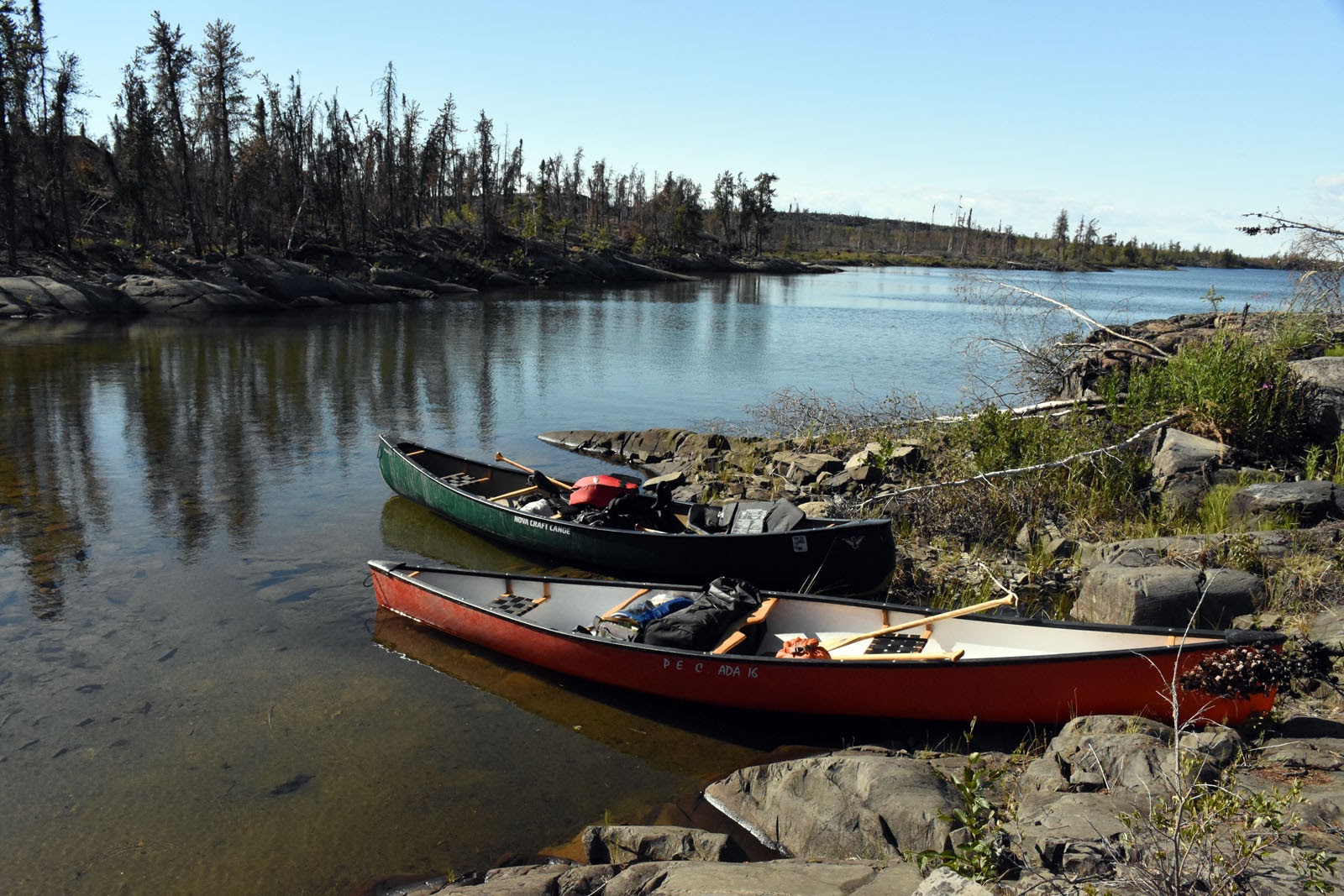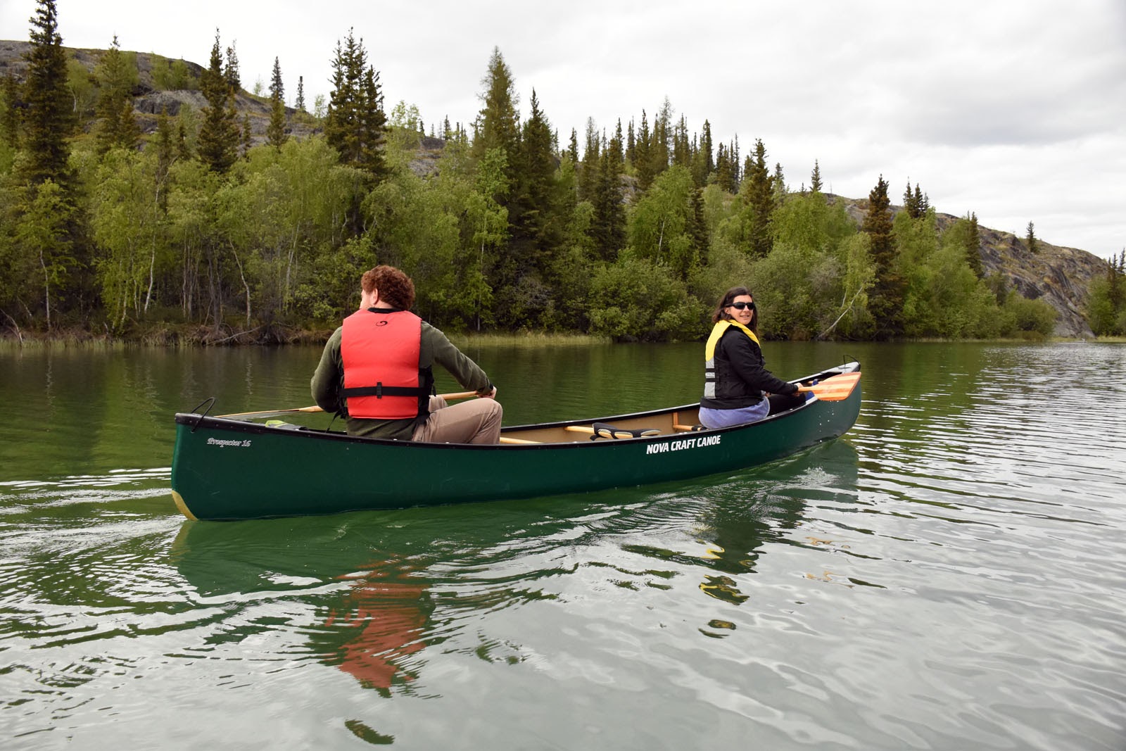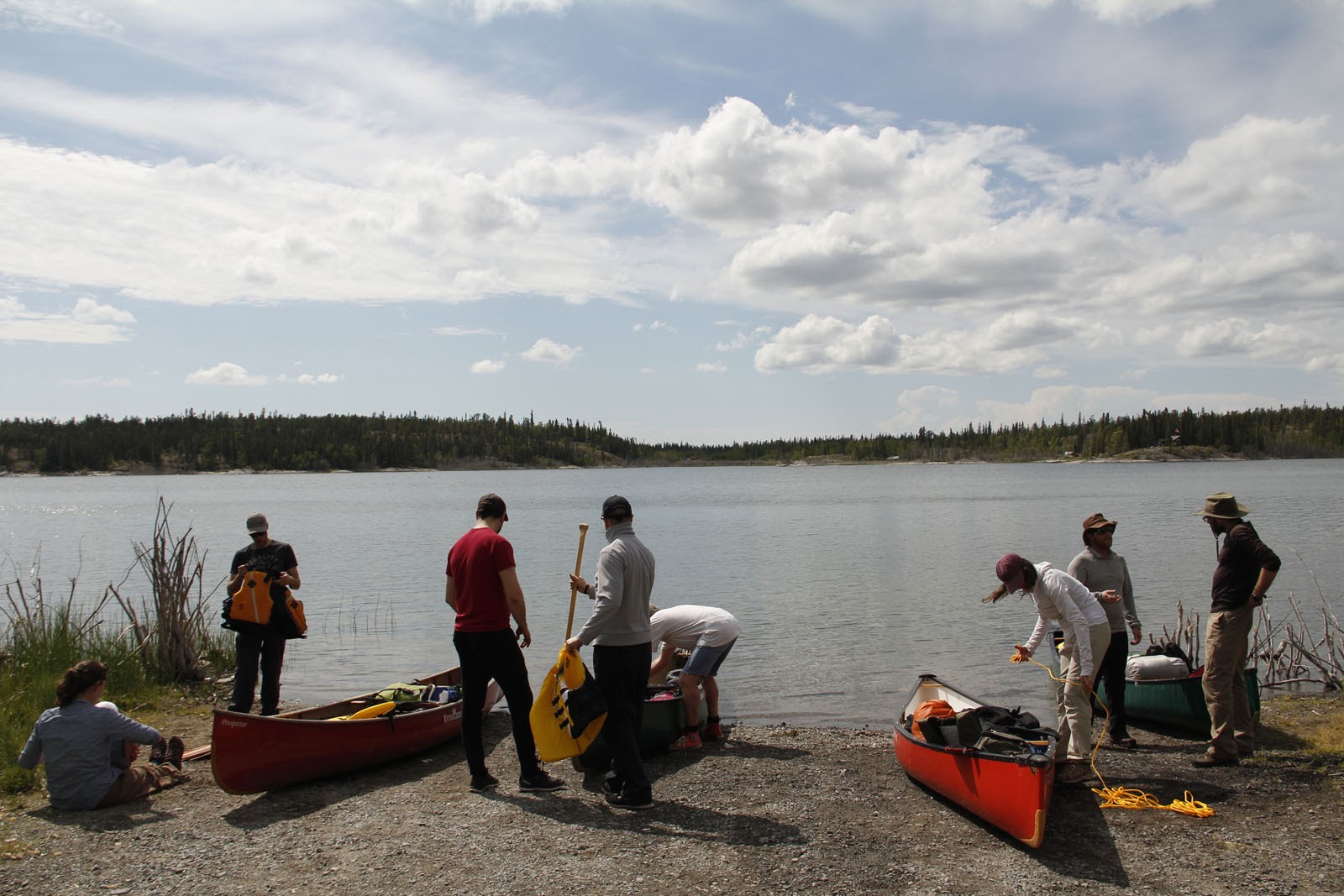 Cette fois-ci, nous nous rendons au lac Tibbitt, à la fin de l’Ingraham Trail. Nous campons sur une île au milieu du lac. Il fait chaud, l’île est dégagée et les moustiques se sont réfugiés dans les bois. Nous passons une soirée autour du feu, jouons aux ricochets, pêchons le brochet et contemplons le soleil de minuit. le Canot a une fissure à l’arrière, il ne prend pas l’eau mais il va falloir réparer avec des bandes de Kevlar feutré et de la résine. Cela sera mon activité de la semaine.