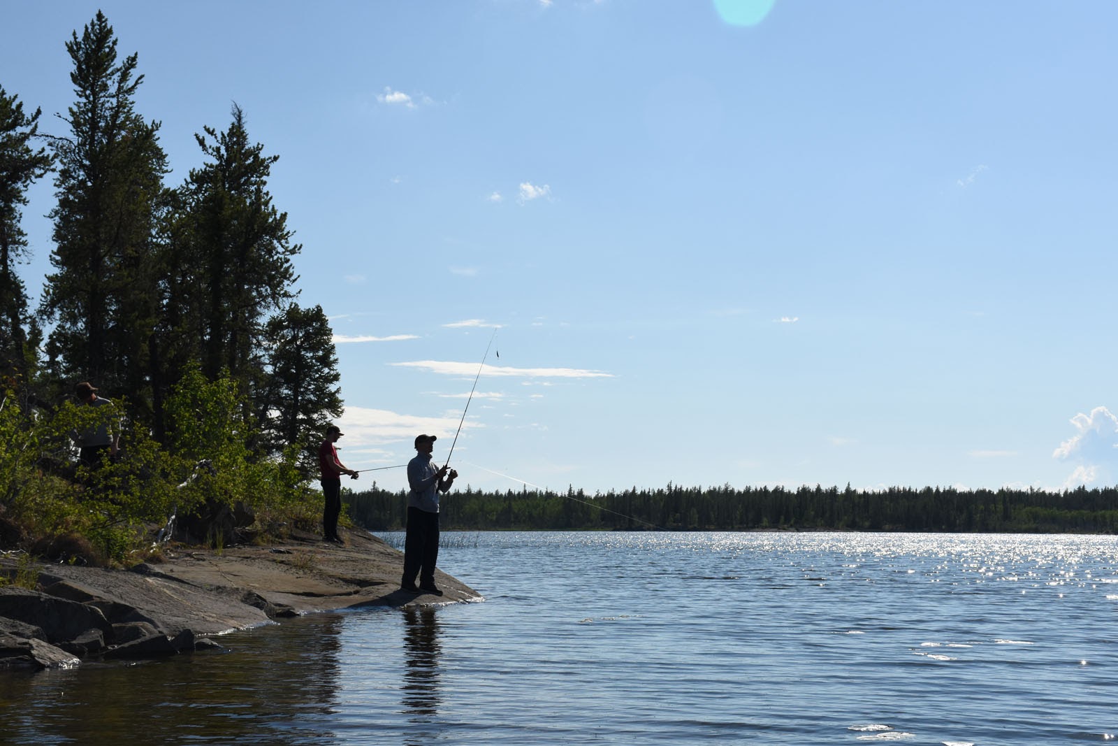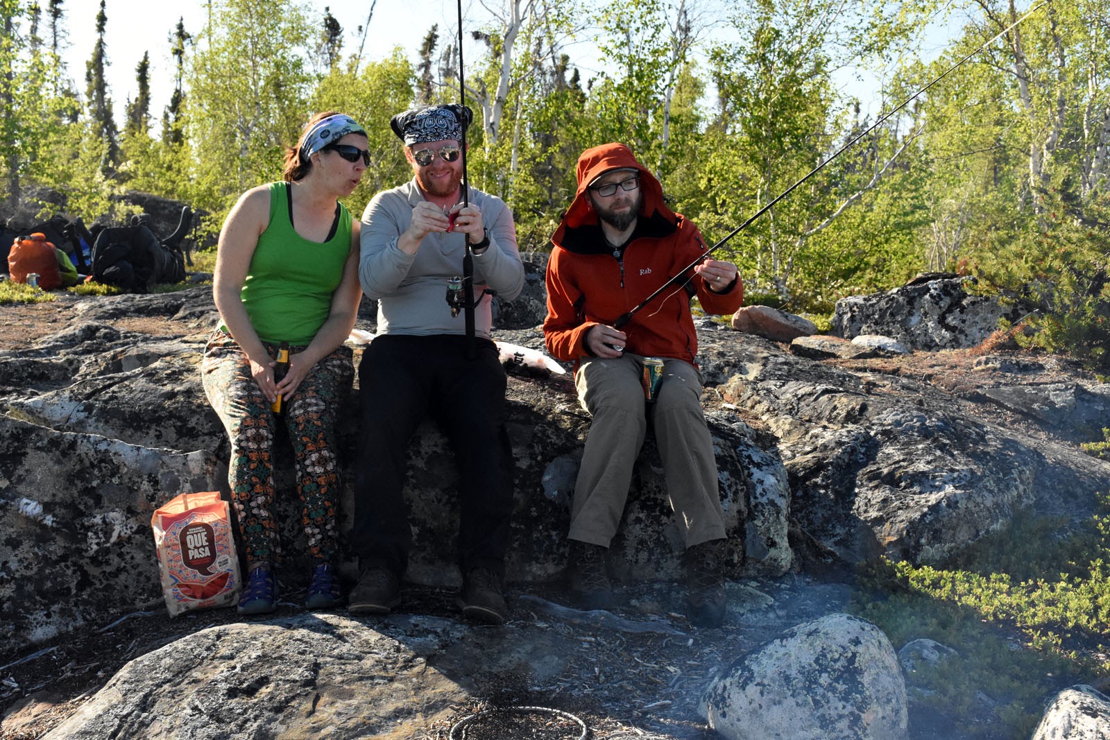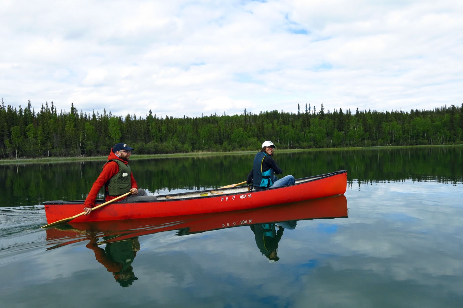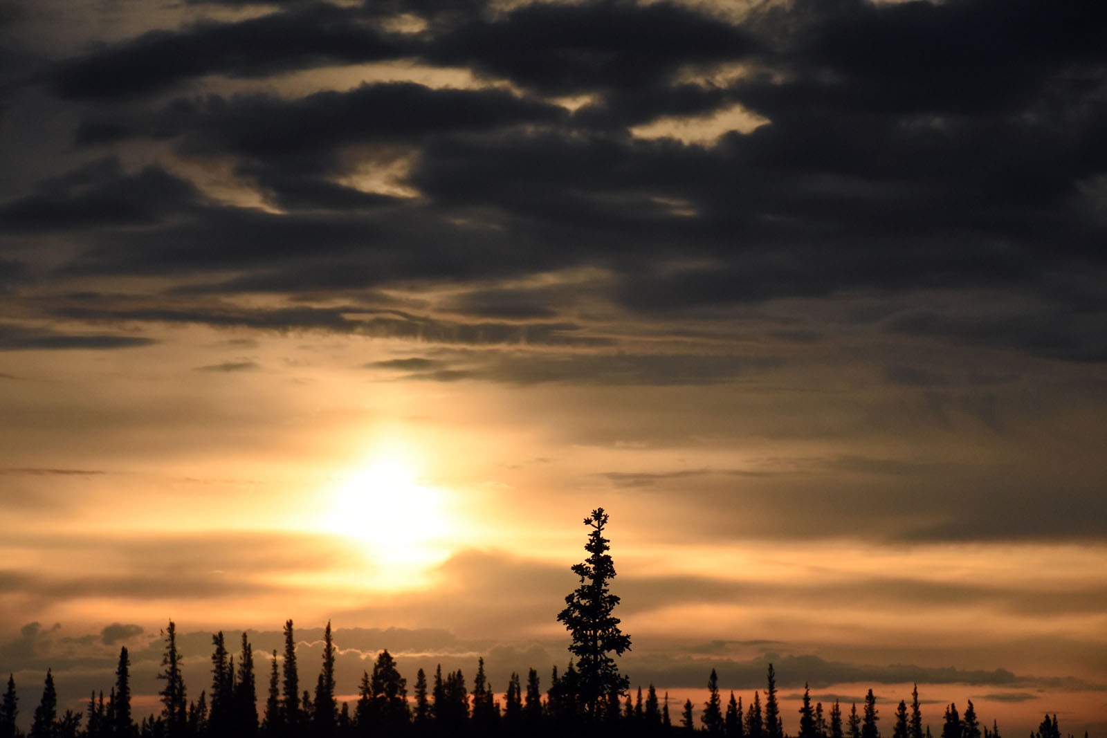 Cette fois-ci, nous nous rendons au lac Tibbitt, à la fin de l’Ingraham Trail. Nous campons sur une île au milieu du lac. Il fait chaud, l’île est dégagée et les moustiques se sont réfugiés dans les bois. Nous passons une soirée autour du feu, jouons aux ricochets, pêchons le brochet et contemplons le soleil de minuit. le Canot a une fissure à l’arrière, il ne prend pas l’eau mais il va falloir réparer avec des bandes de Kevlar feutré et de la résine. Cela sera mon activité de la semaine.