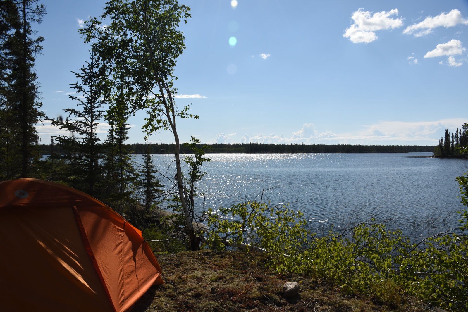 Pour l’anniversaire d’Yves, nous sommes allés camper dans les bois à Tartan Rapids. Les tartan Rapids se trouvent sur la rivière Yellowknife, au sud du lac Prosperous. Le vendredi soir, nous avons conduit jusqu’à Cassidy Point et nous avons ensuite pagayé jusqu’à Tartan Rapids. Bon, nous ne sommes pas des pros des eaux vives (white waters) alors nous avons utilisé le portage qui nous a permis de contourner les rapides.