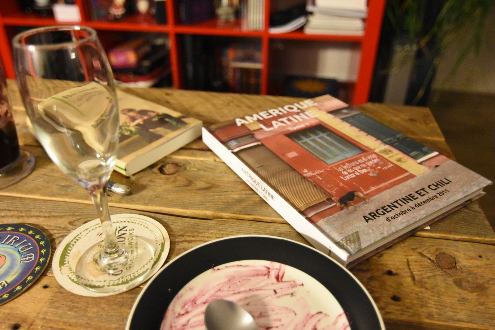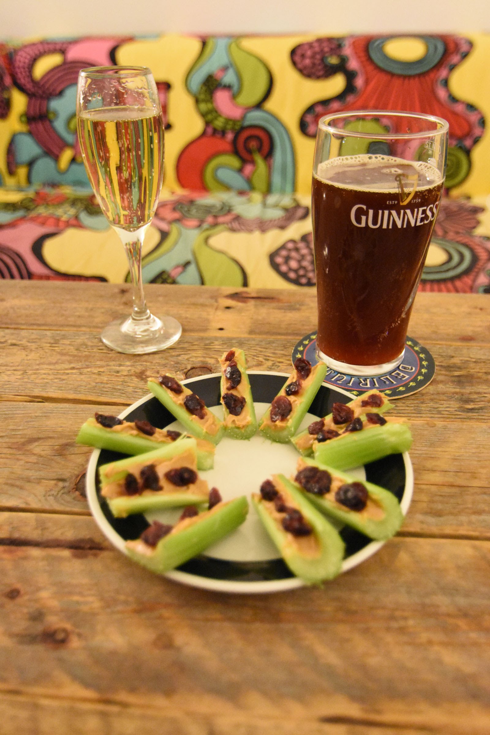 Pour l’apéro : « ants on a log » (traduction : fourmis sur une branche). Il s’agit de branches de céleri remplies de beurre de cacahuètes, sur lesquelles on pose des canneberges séchées. Bon, d’accord, cela ne semble pas très raffiné. Mais Marissa (notre couchsurfeuse américaine) nous a fait découvrir ça récemment, et nous avons vraiment bien aimé. Et contre toute attente, ça va très bien avec le champagne!
